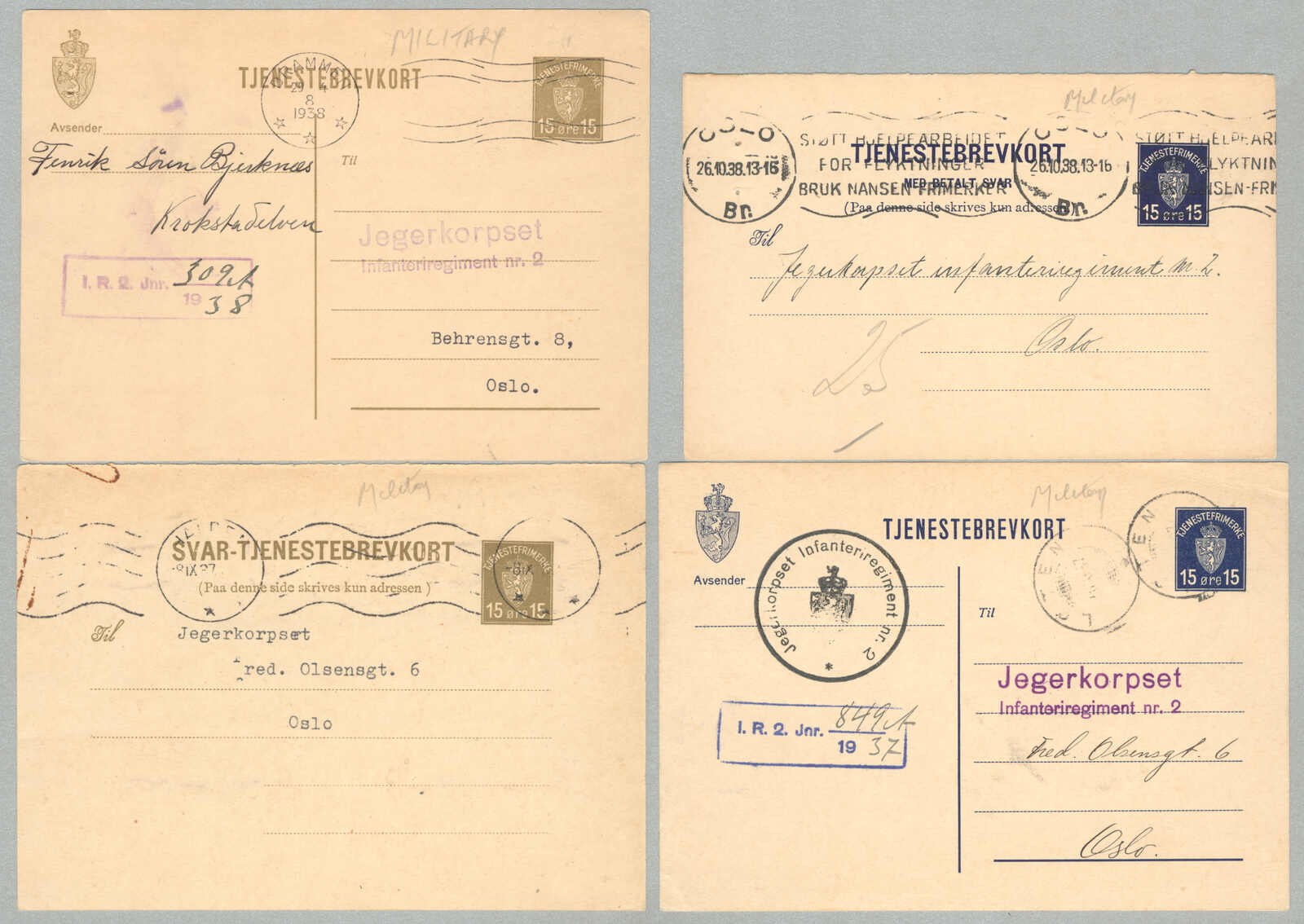 1937-38, group of (4) military service postcards sent by Norwegian infantry recruits and junior officers to the Jegerkorpset Infanteriregiment nr. 2 in Oslo, uprated with official 15 ore blue and brown military franchise stamps tied by