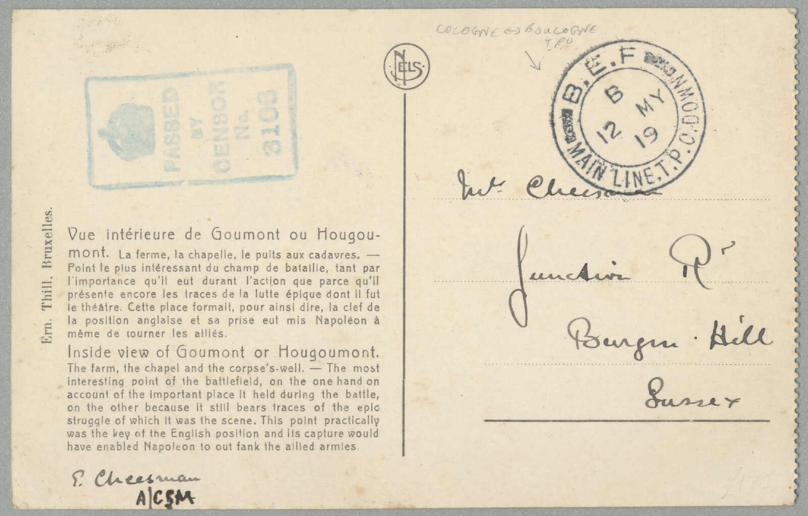 1919, from Cologne to Burgess Hill, unfranked picture postcard showing interior view of Hougoumont farm near Waterloo battlefield, mailed by a member of the British Expeditionary Force in postwar Germany, cancelled with clear B.E.F. MAIN