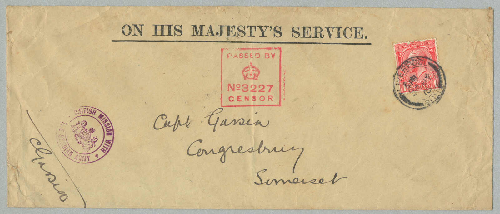 1915, from Liverpool to Somerset, official envelope inscribed ON HIS MAJESTYS SERVICE, franked with 1d red King George V tied by LIVERPOOL 6PM 33 JY 15, red boxed PASSED BY CENSOR No. 3227 handstamp, violet circular cachet BRITISH MISSION