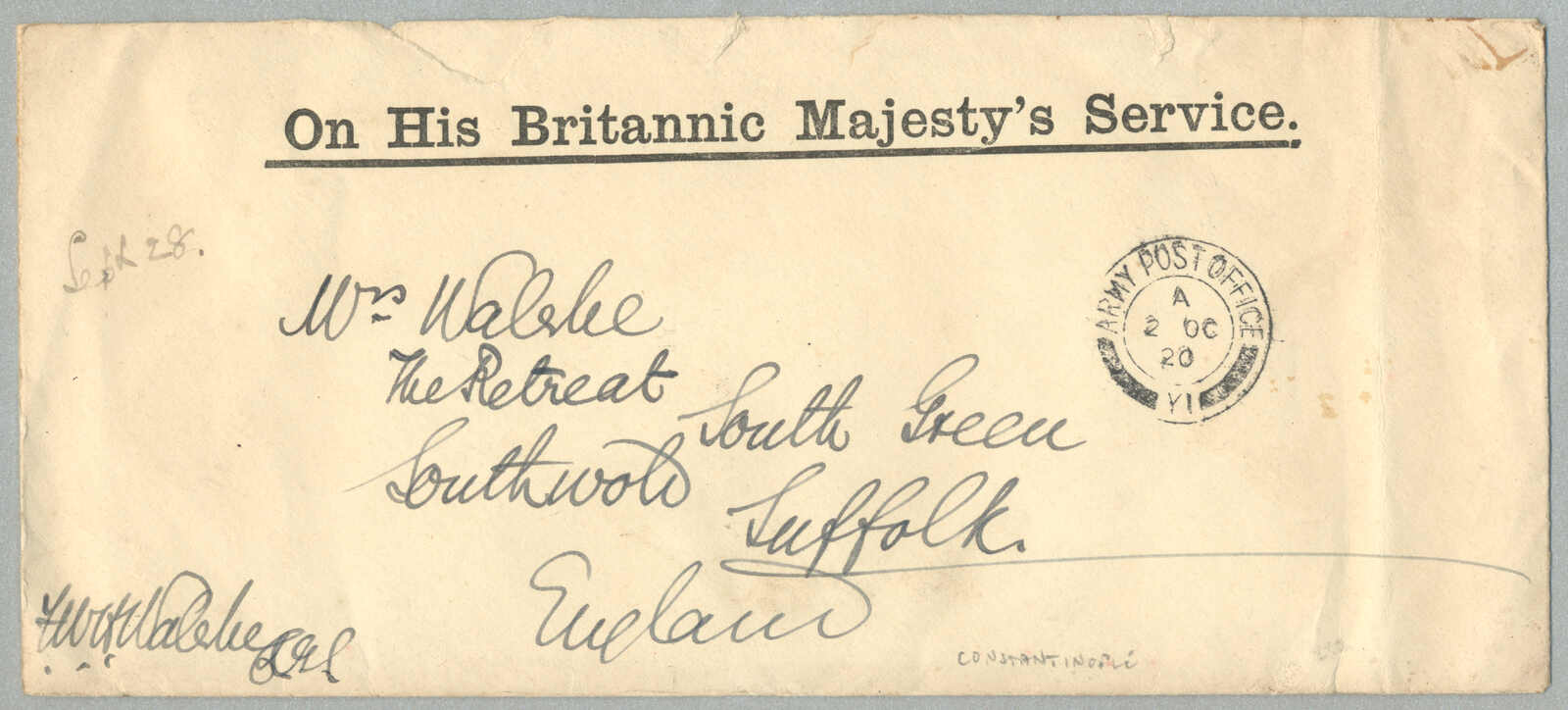 1920, from British occupation forces in Constantinople to Suffolk, official envelope inscribed ON HIS BRITANNIC MAJESTYS SERVICE, black circular ARMY POST OFFICE A 2 OC 20 YI datestamp, no franking as sent under official service