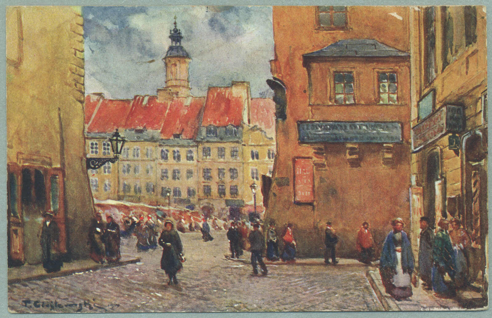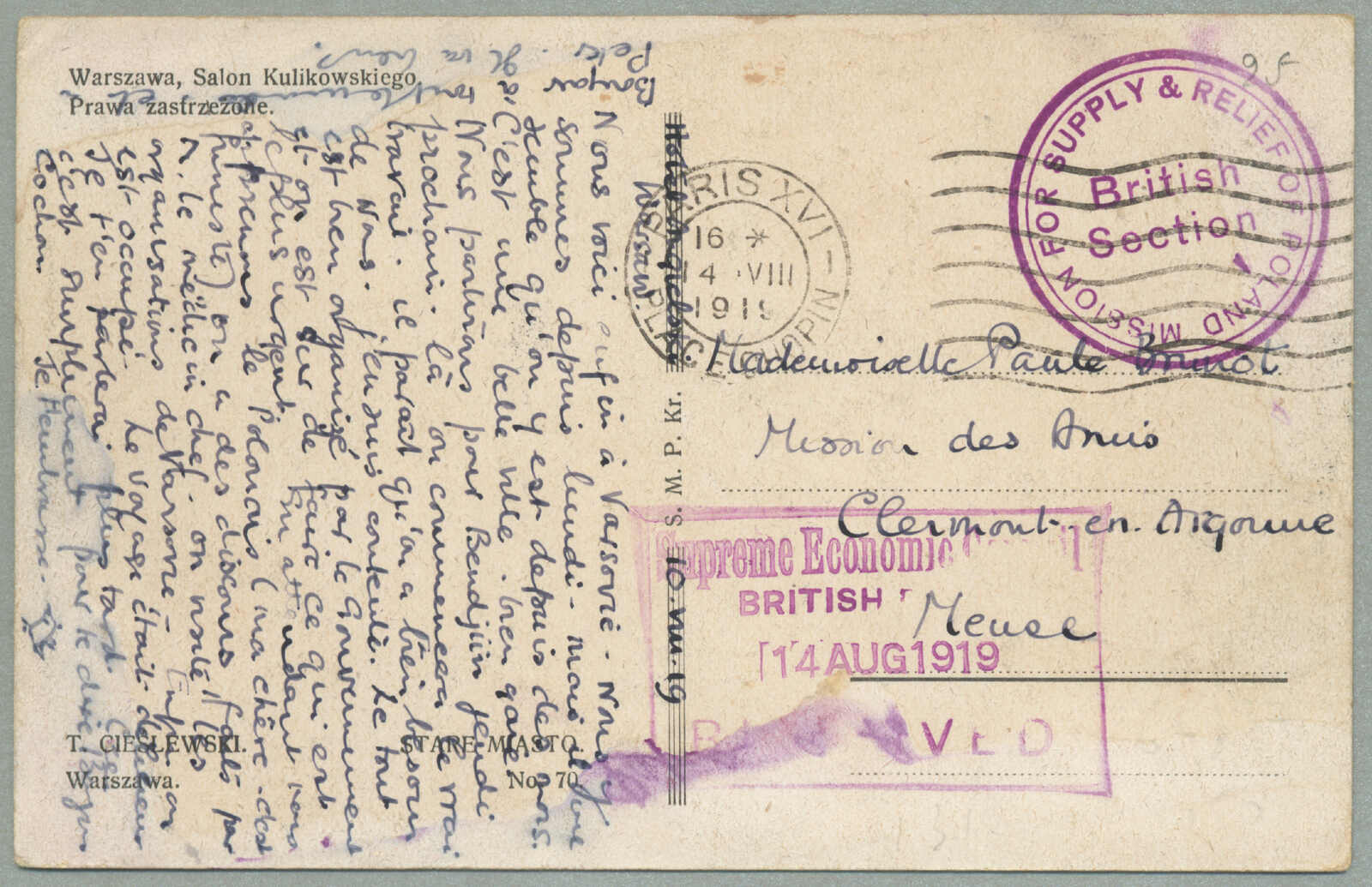 1919, British post offices abroad, from Warsaw to Clermont en Argonne, postcard showing Warsaw street scene, carried by British military courier during Mission for Supply and Relief of Poland, violet circular cachet FOR SUPPLY AND RELIEF