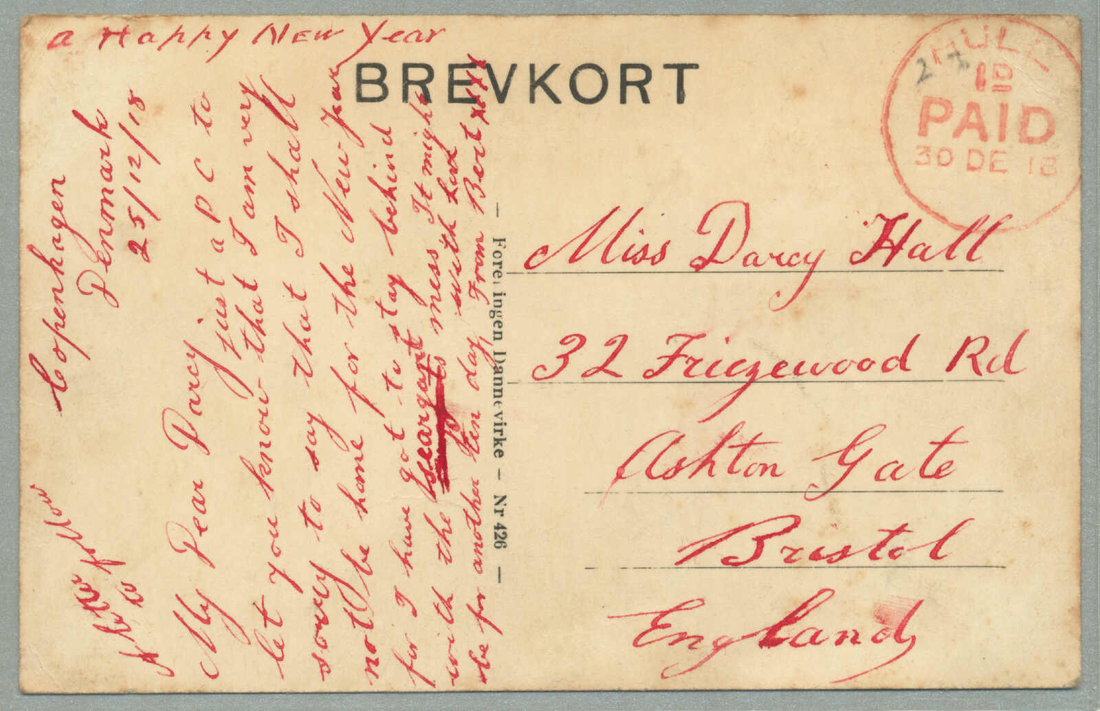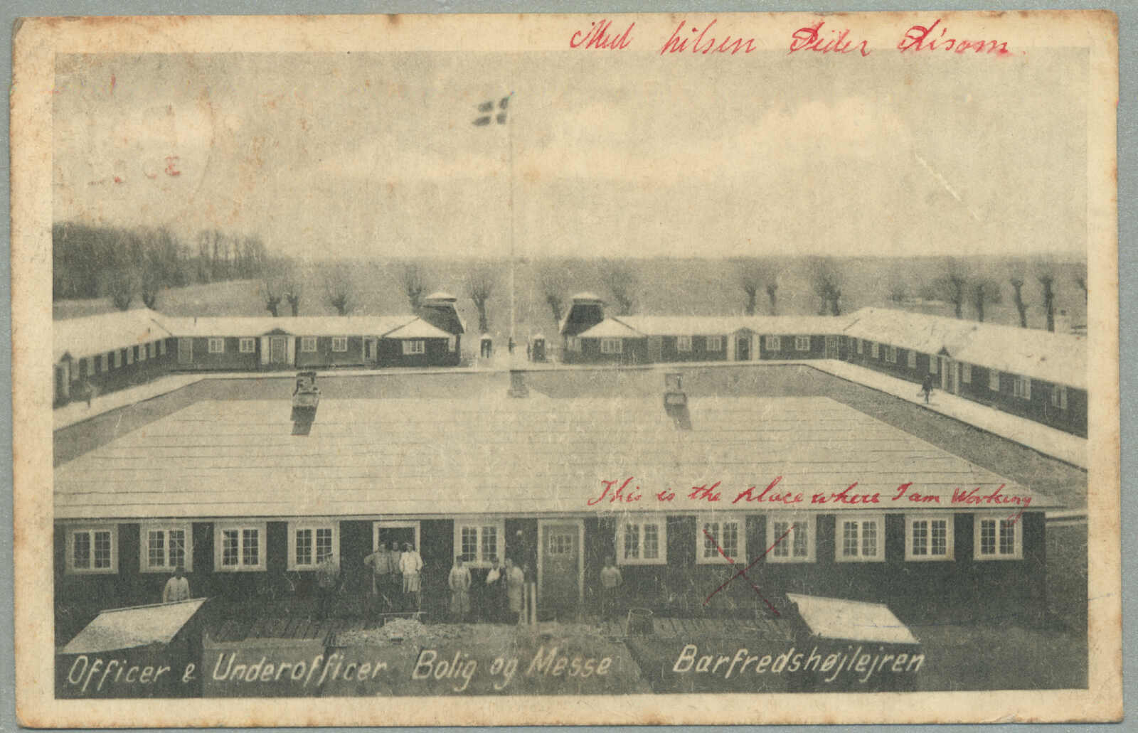 1918, British post offices abroad, from Copenhagen to Bristol, red manuscript dated 25 December 1918, message indicating sender's work at POW camp in Denmark, picture side shows Officer & NCO quarters at Barfredshejlejren camp,