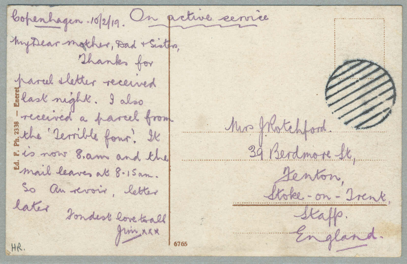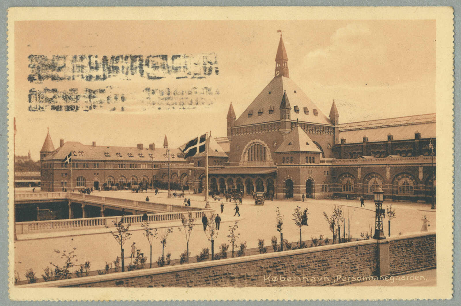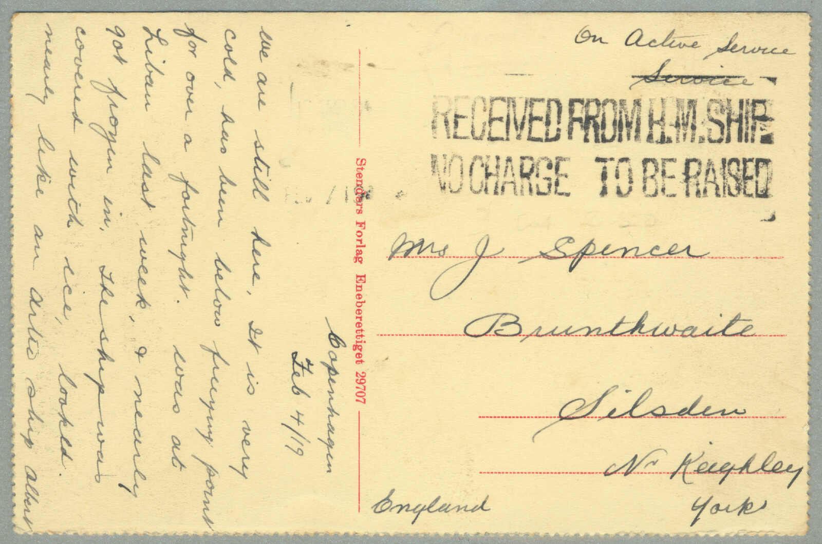 1919, British post offices abroad, from Copenhagen to Silsden, dated Feb 4 1919, undivided back picture postcard showing Copenhagen train station, ON ACTIVE SERVICE, handstamped RECEIVED FROM H M SHIP NO CHARGE TO BE RAISED, no franking