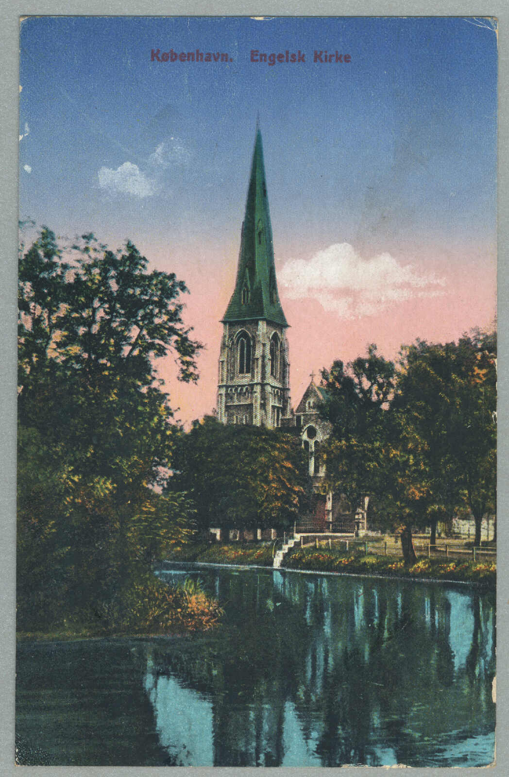 1919, British post offices abroad, from Copenhagen to Stoke on Trent, Kenton, dated 10 February 1919, multicolored viewcard showing the Anglican church in Copenhagen, written by British serviceman assisting in POW evacuation after