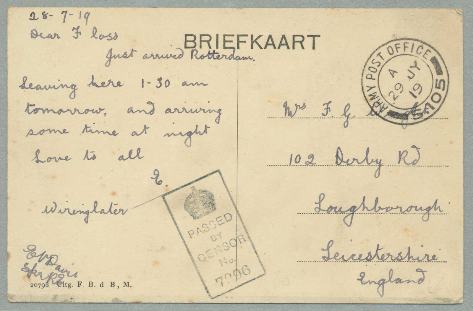 1919, British post offices abroad, from Rotterdam to Loughborough, British Army picture postcard showing Venlo Vleeschstraat, datelined 28 July 1919 and cancelled ARMY POST OFFICE S 105 29 JY 19, endorsed by sender as military mail, boxed
