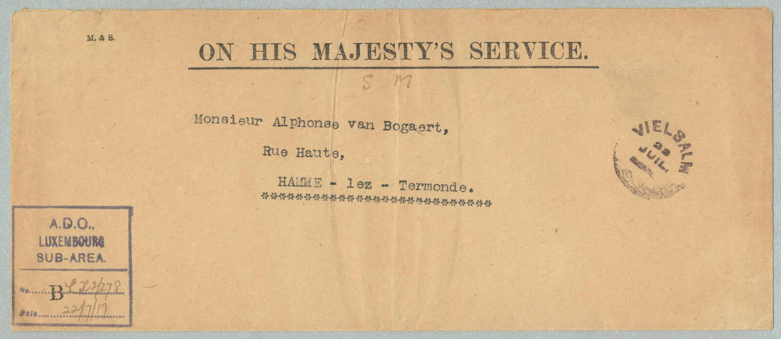 1919, British field post abroad, from Vielsalm to Hamme lez Termonde, OHMS envelope marked ON HIS MAJESTYS SERVICE and endorsed A D O LUXEMBOURG SUB AREA B/22 7 19, originating from British forces in Luxembourg, no British field post