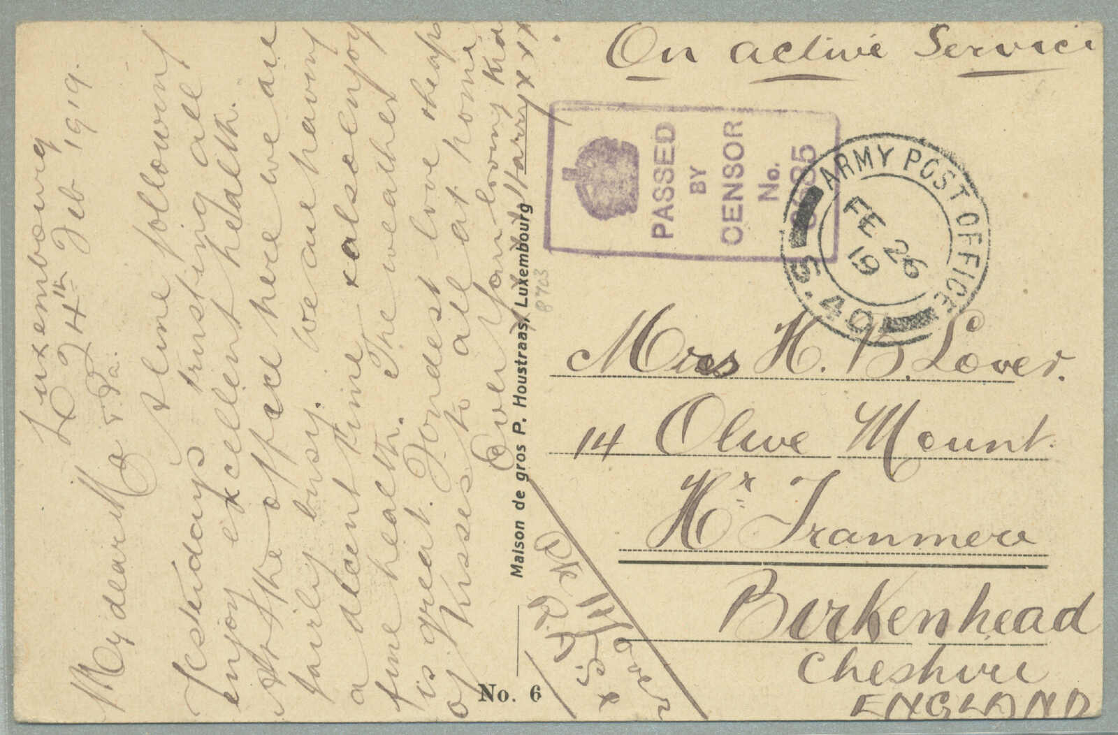 CENSOR marking, sender note dated 24 February 1919, mailed from British soldier stationed in Luxembourg, no British field post office established locally, card routed via British army post facilities outside the Grand Duchy, illustrates early British