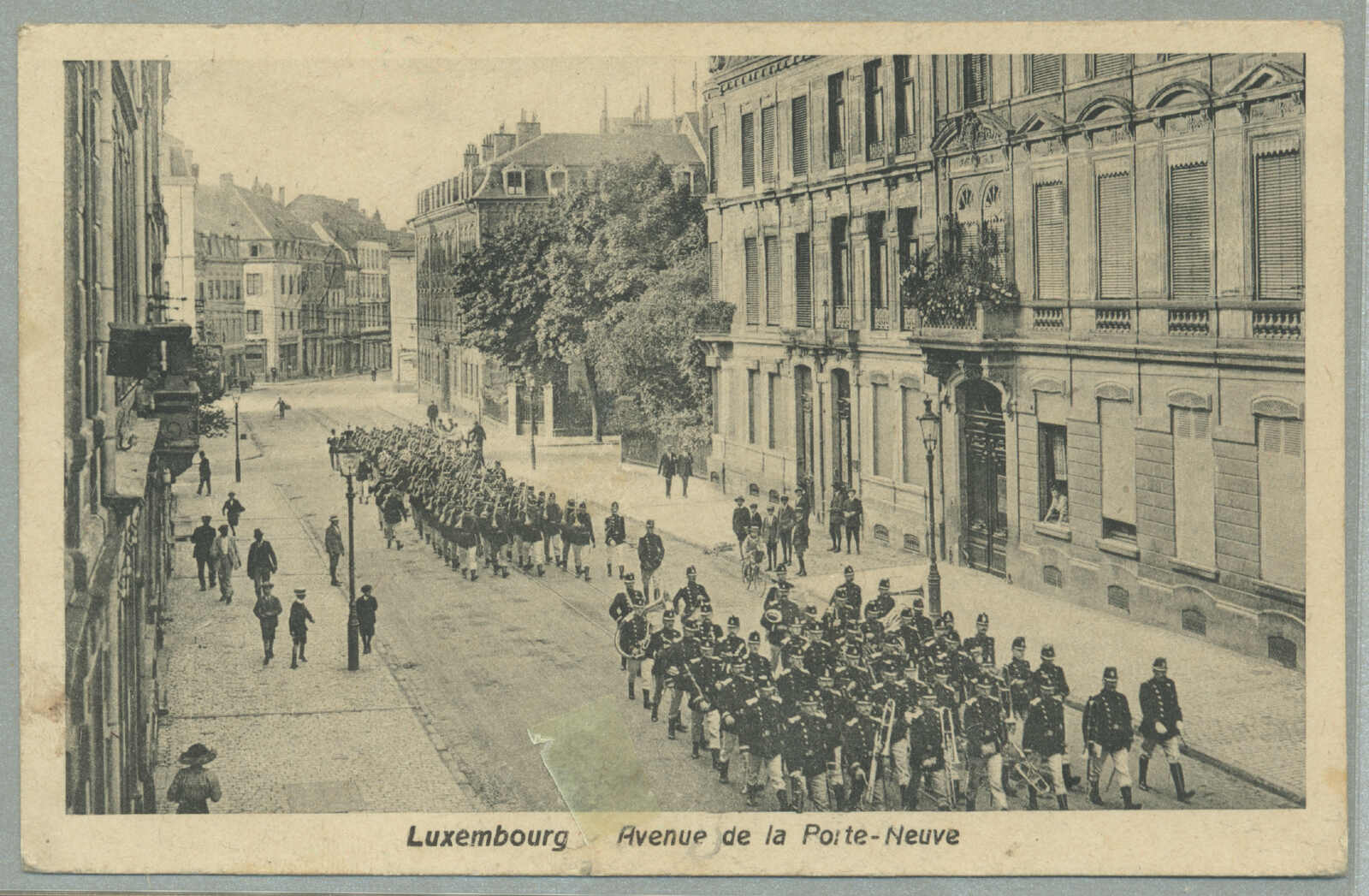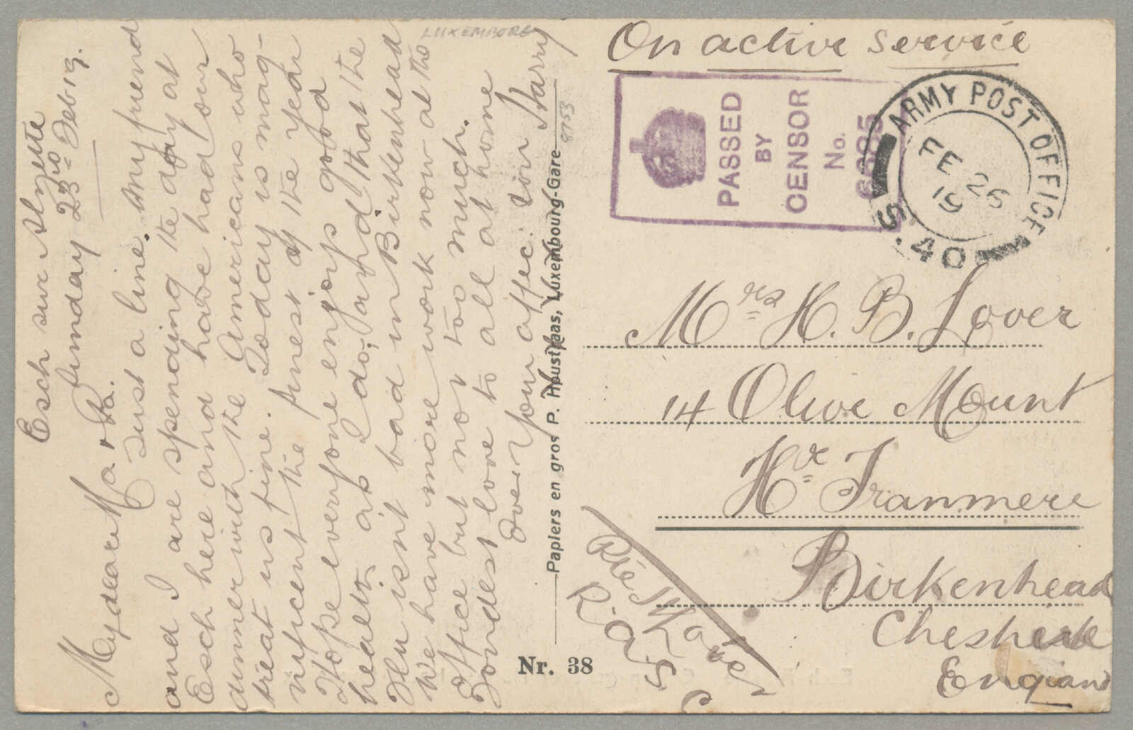 1919, British field post abroad, from Luxembourg to Birkenhead, Cheshire, multiview military postcard depicting Avenue de la Porte Neuve, endorsed ON ACTIVE SERVICE, cancelled ARMY POST OFFICE S 40 FE 26 19, with rectangular PASSED BY