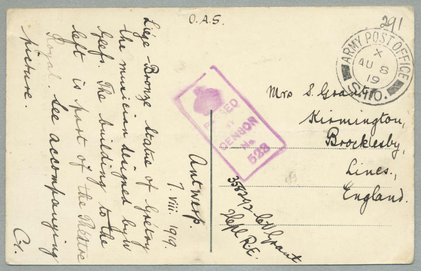 cancellation dated 8 August 1919, violet boxed PASSED BY CENSOR 528 handstamp, manuscript O A S indicating On Active Service, message references location and statue, mailed shortly after World War I armistice during British military presence in