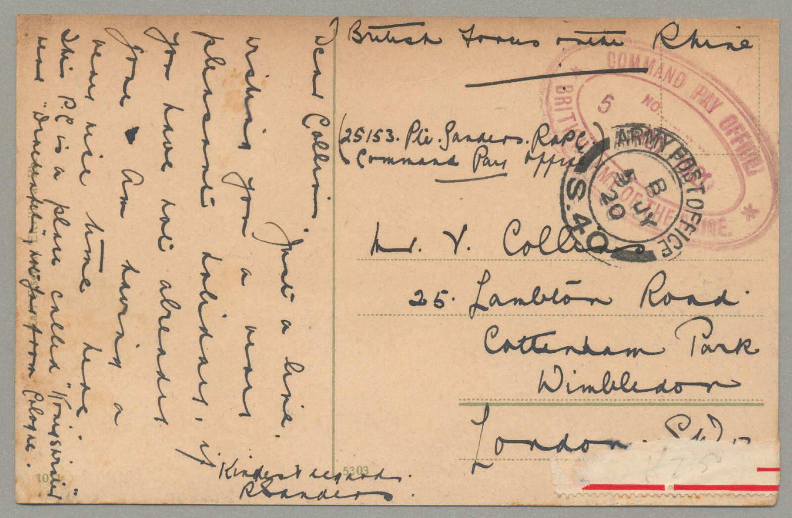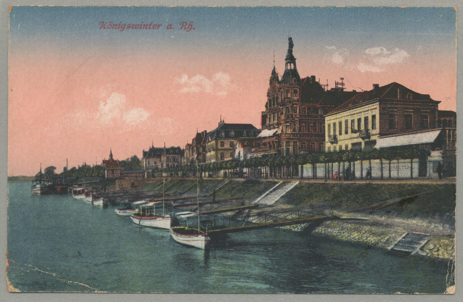 1920, from Königswinter, Germany to London, coloured picture postcard depicting riverside buildings along the Rhine in Königswinter, posted 5 July 1920 by British occupation soldier with personal message, free franked according to
