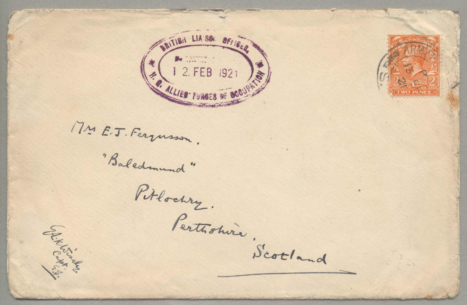1921, from British Headquarters in the Rhineland to Pitlochry, Scotland, envelope franked with Great Britain King George V 2d orange, tied by circular military datestamp 12 FEB 1921, violet oval cachet BRITISH LIAISON OFFICER HQ ALLIED