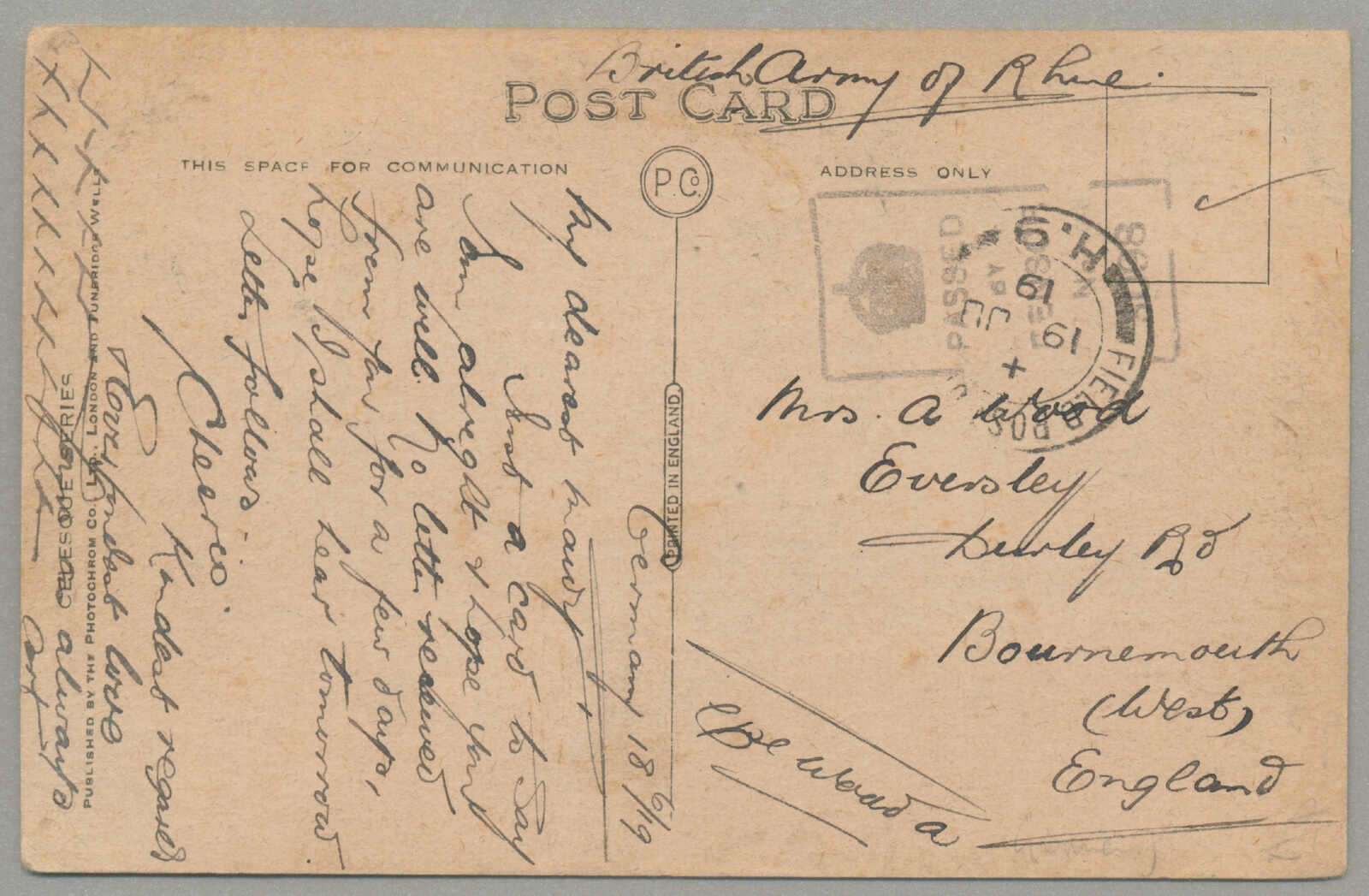 1919, from Euskirchen, Germany to Bournemouth, colour picture postcard depicting West Marina at St Leonards on Sea, sent by British Army soldier serving with IX Corps, franked under military franchise, clear FIELD POST OFFICE H9 cds dated