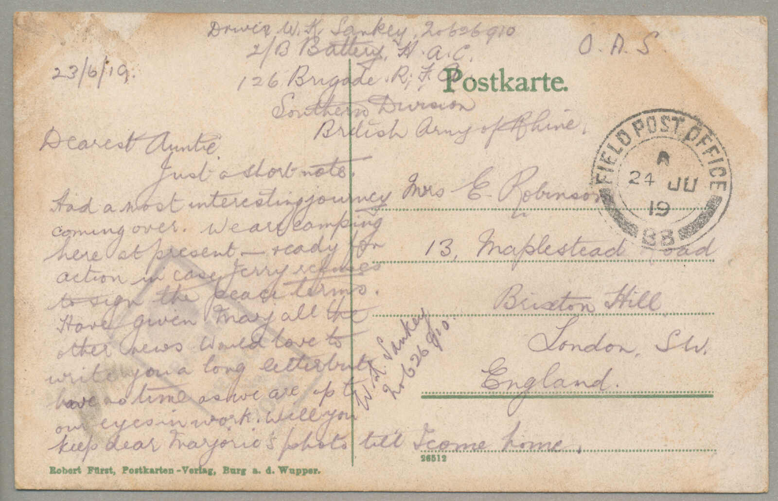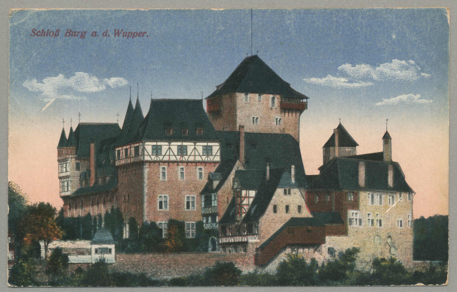 1919, from Coblenz to London, multicolour picture postcard depicting Schloss Burg an der Wupper, posted 24 June 1919 by soldier of the Southern Division of the British Army of the Rhine, sent free of charge under military franchise