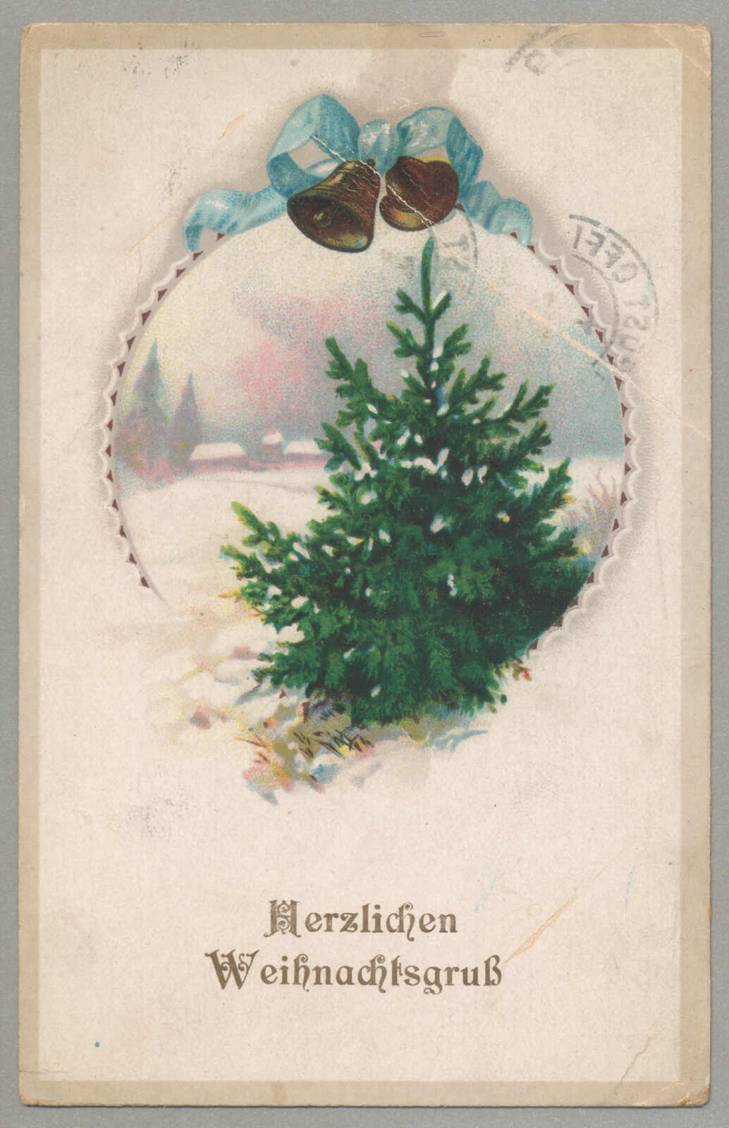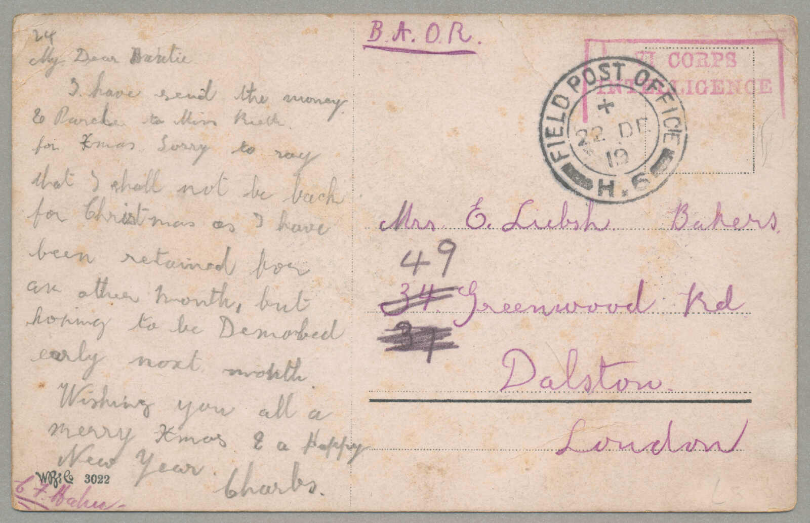 1919, from Düren to London, embossed multicolour picture postcard with Christmas greeting Herzlichen Weihnachtsgruß, sent by British Army soldier of VI Corps, endorsed BAOR and bearing boxed violet cachet VI CORPS INTELLIGENCE, full FIELD