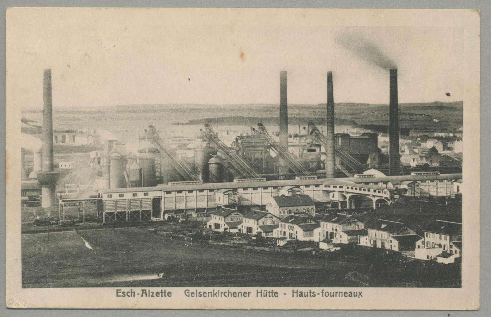 1919, from Esch Alzette, Luxembourg, to Birkenhead, England, black and white photo postcard depicting Gelsenkirchener Hütte industrial complex at Esch, posted on active service without postage under military franchise, boxed PASSED BY