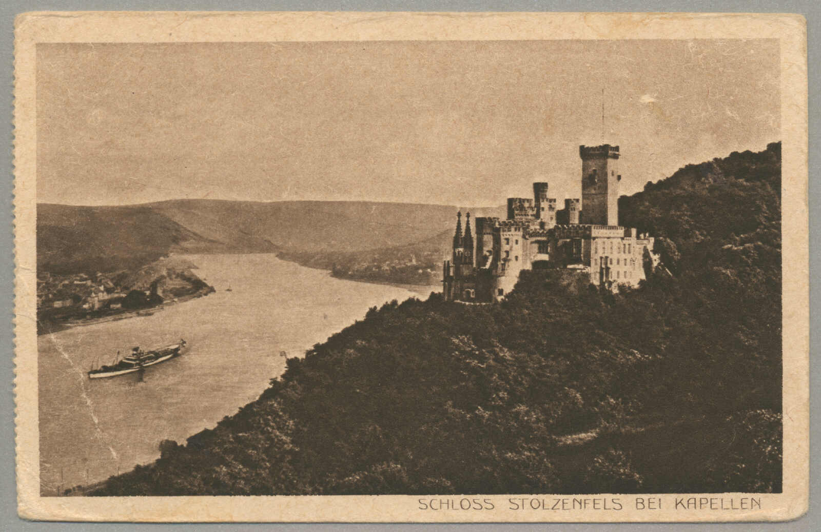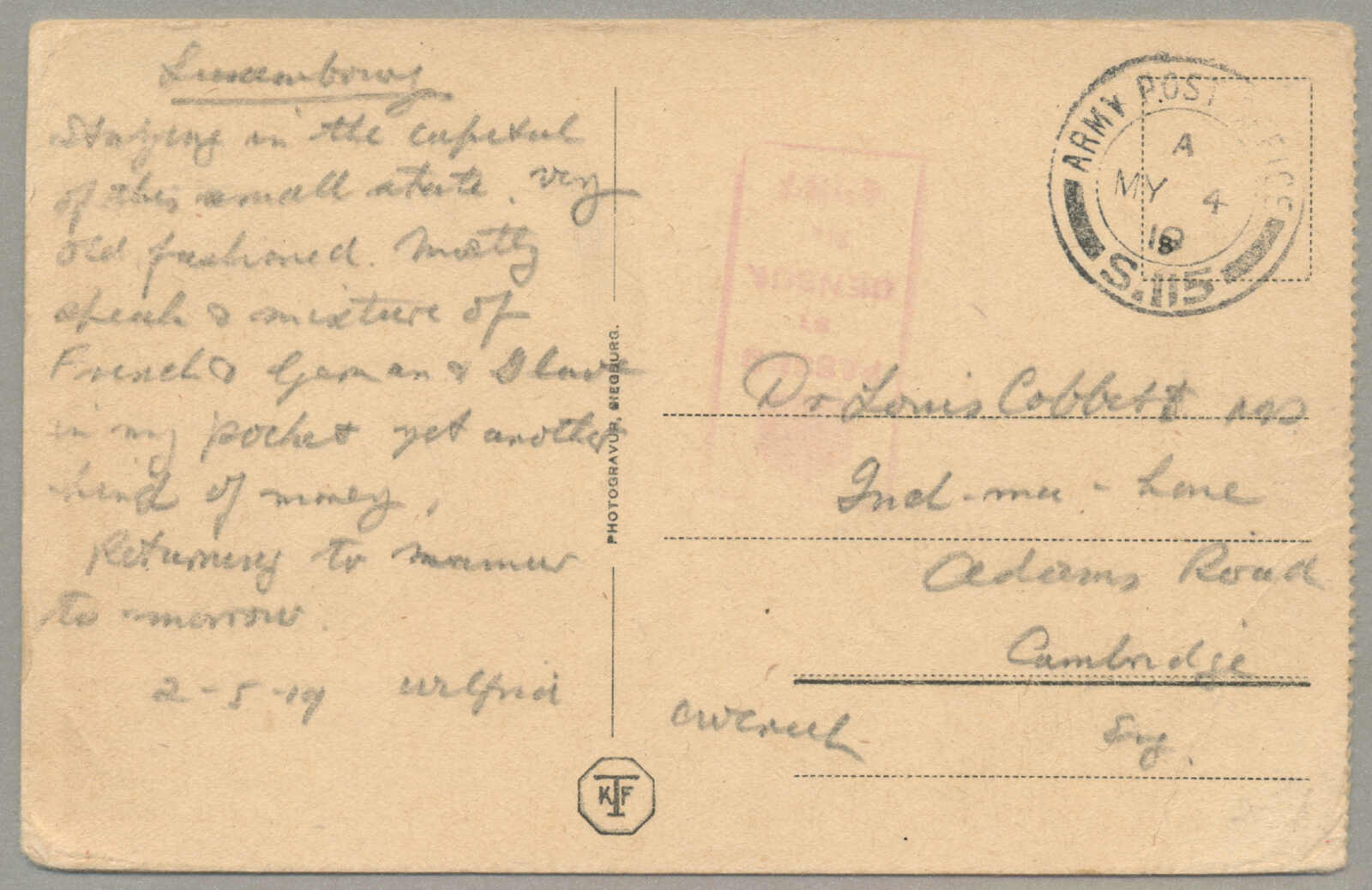 1919, from Luxembourg City to Cambridge, black and white real photo postcard depicting Schloss Stolzenfels overlooking the Rhine near Koblenz, written 2 May 1919 and posted 4 May 1919, transmitted free of charge under military franchise,