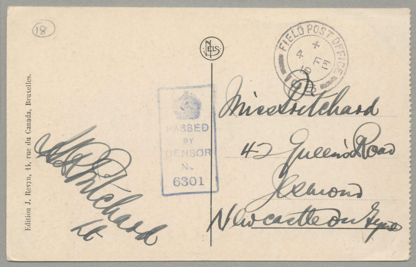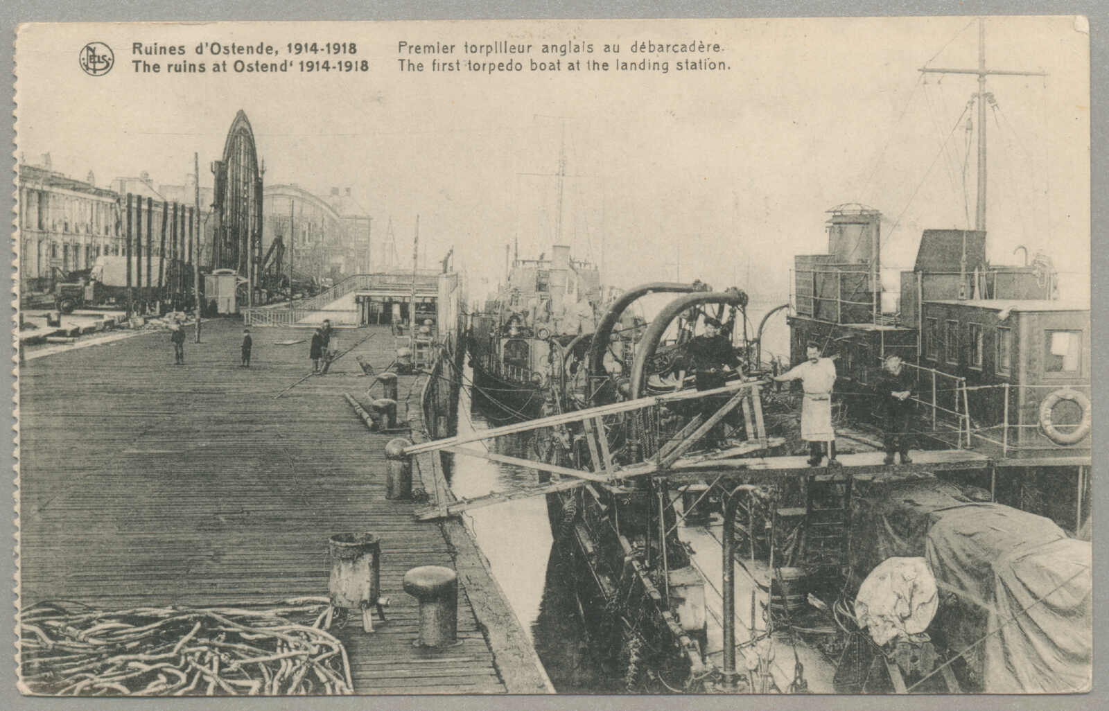 1919, from Ostend to Newcastle on Tyne, black and white real photo postcard titled The ruins at Ostend 1914-1918, showing British torpedo boat at the landing pier, posted 4 February 1919 under military franchise, cancelled FIELD POST