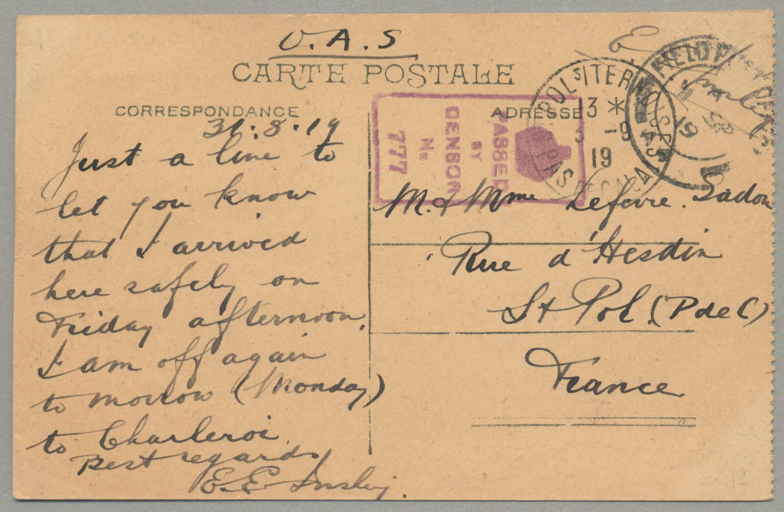 OFFICE 4 on 1 September 1919, violet boxed PASSED BY CENSOR 777 cachet, sent under military franchise via British Army postal channels, FPO 4 was part of a mobile postal system that followed the movements of British units, as opposed to static APOs,
