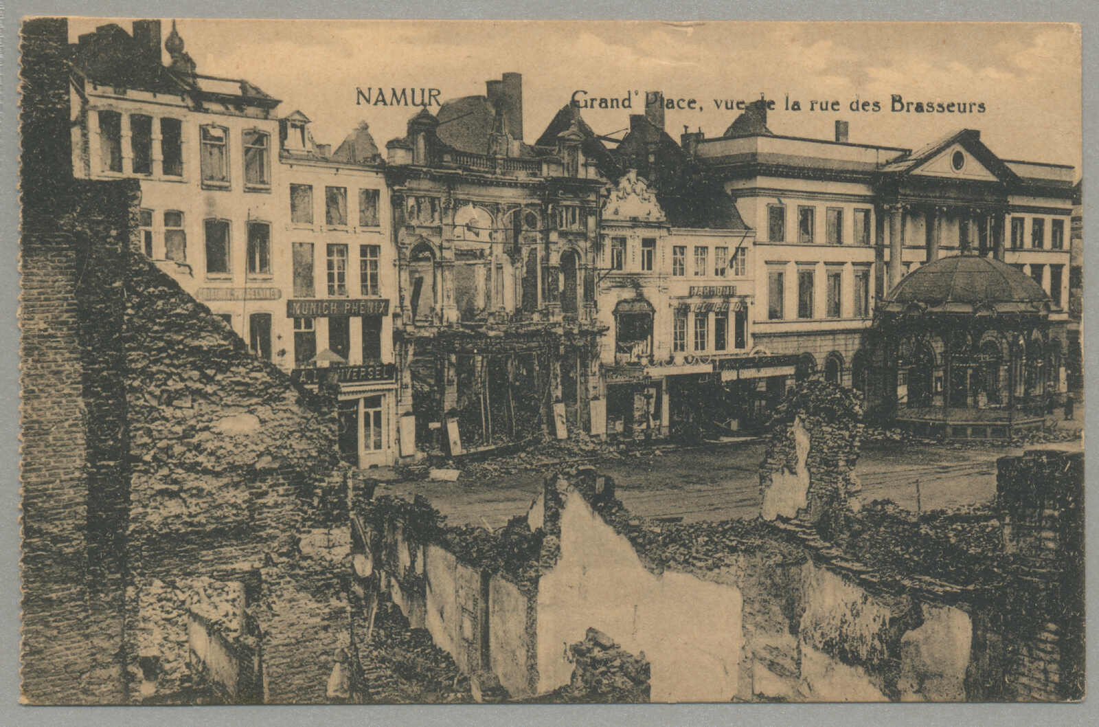 1919, from Namur to St Pol, France, sepia photo postcard titled Grand Place, vue de la rue des Brasseurs, showing extensive damage to city center buildings after German occupation, message dated 31 August 1919, card cancelled FIELD POST