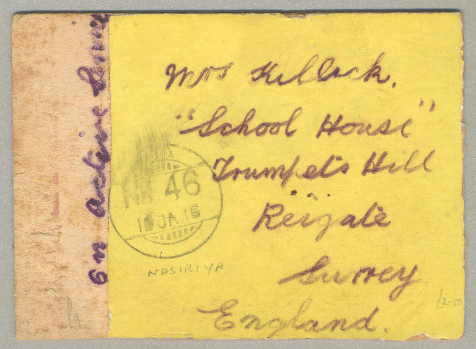 1916, from NASIRIYA to REIGATE, England, yellow field stationery card written On Active Service, cancelled BASE OFFICE No. 46 10 JA 16 (Indian Army postmark used in Mesopotamia), c/c P.P.M. Bombay indicating routing via military post