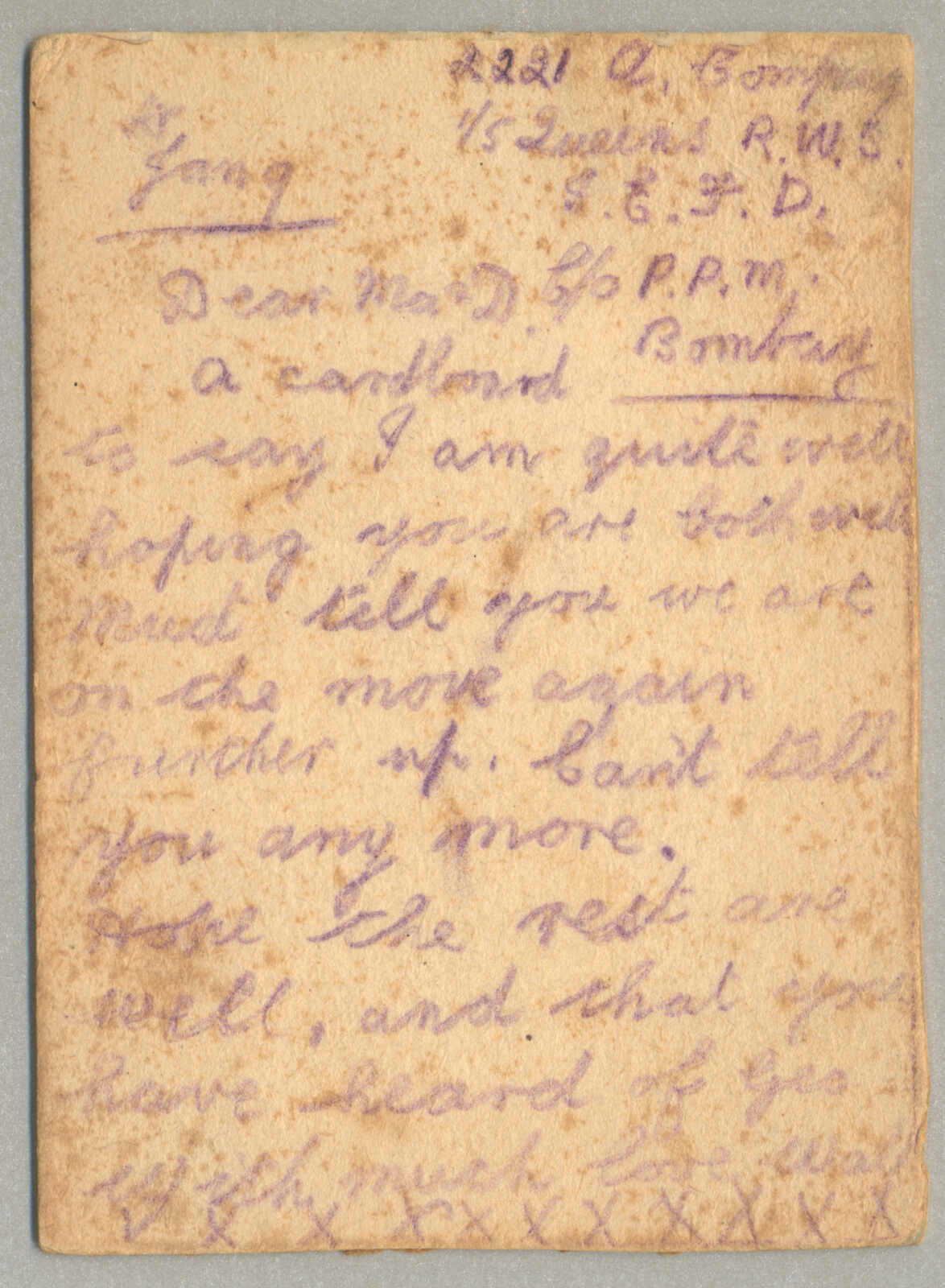medical support and logistical hardship, the use of improvised field stationery reflects scarcity of supplies and frontline urgency, military censorship and routing via BOMBAY underscores imperial postal coordination across war zones, REIGATE likely