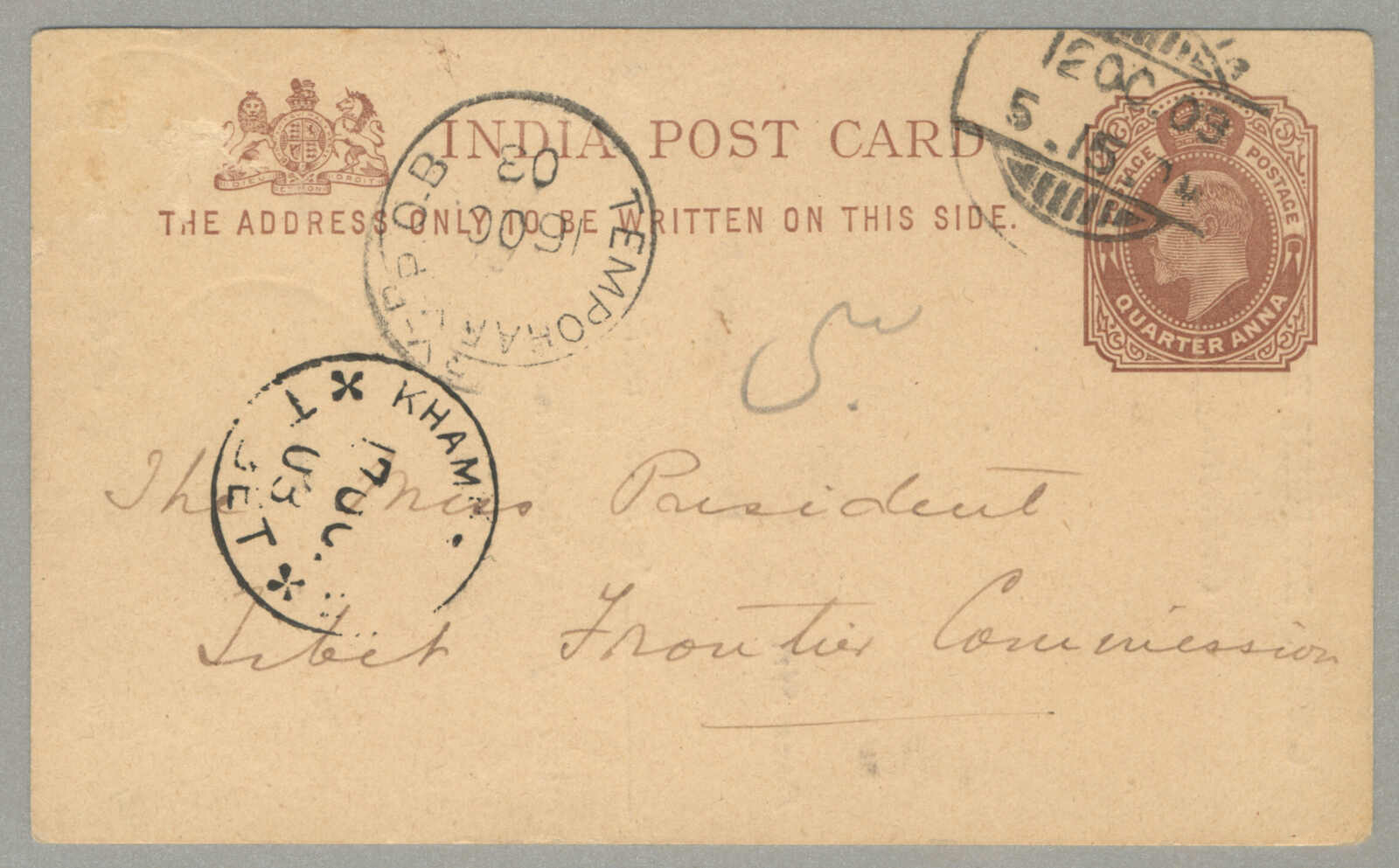 1903, from Calcutta to Tibet, addressed to the President of the Tibet Frontier Commission, 1/4 anna brown India postal stationery card, TEMPORARY P.O. D 7 JUN 1903, arrival mark KHAMBA-JONG TIBET 17 OCT 1903, message from the Great