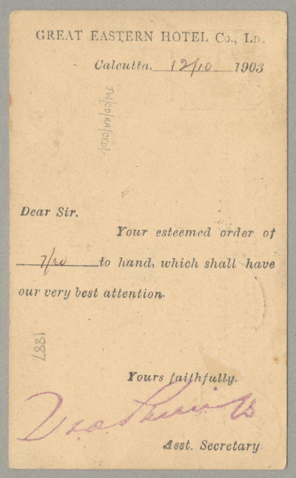 Eastern Hotel Co. Calcutta dated 2 September 1903 regarding a supply order, rare example of internal logistical correspondence to a British officer in the field during the early phase of the Younghusband Mission, mailed through temporary field post