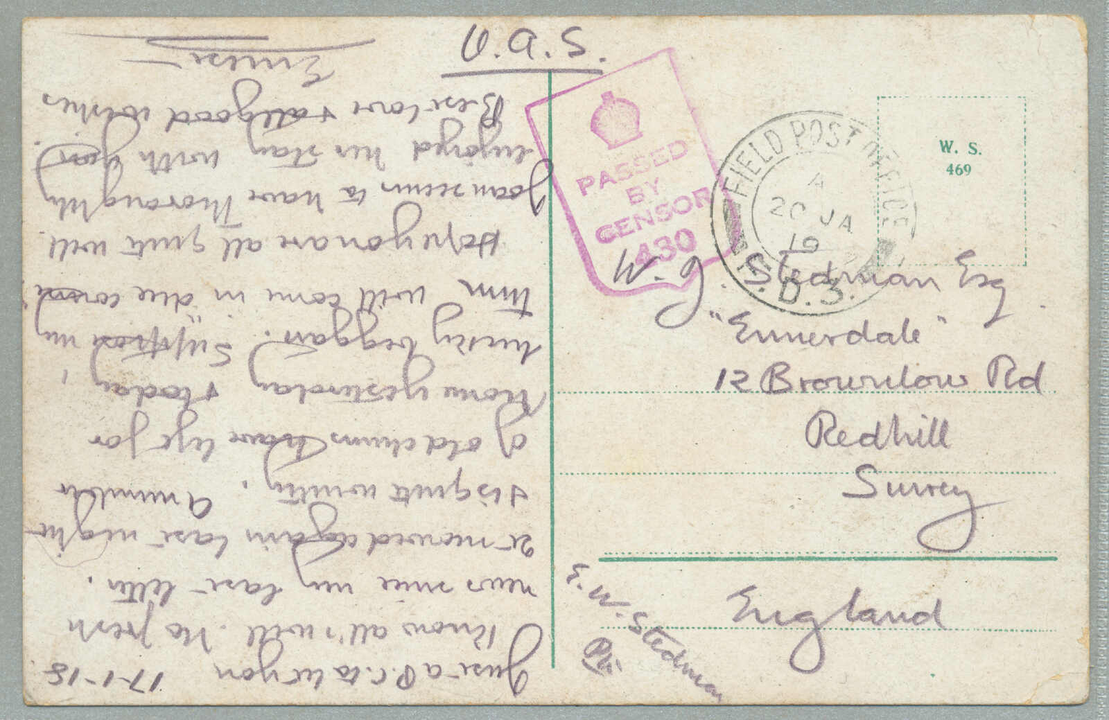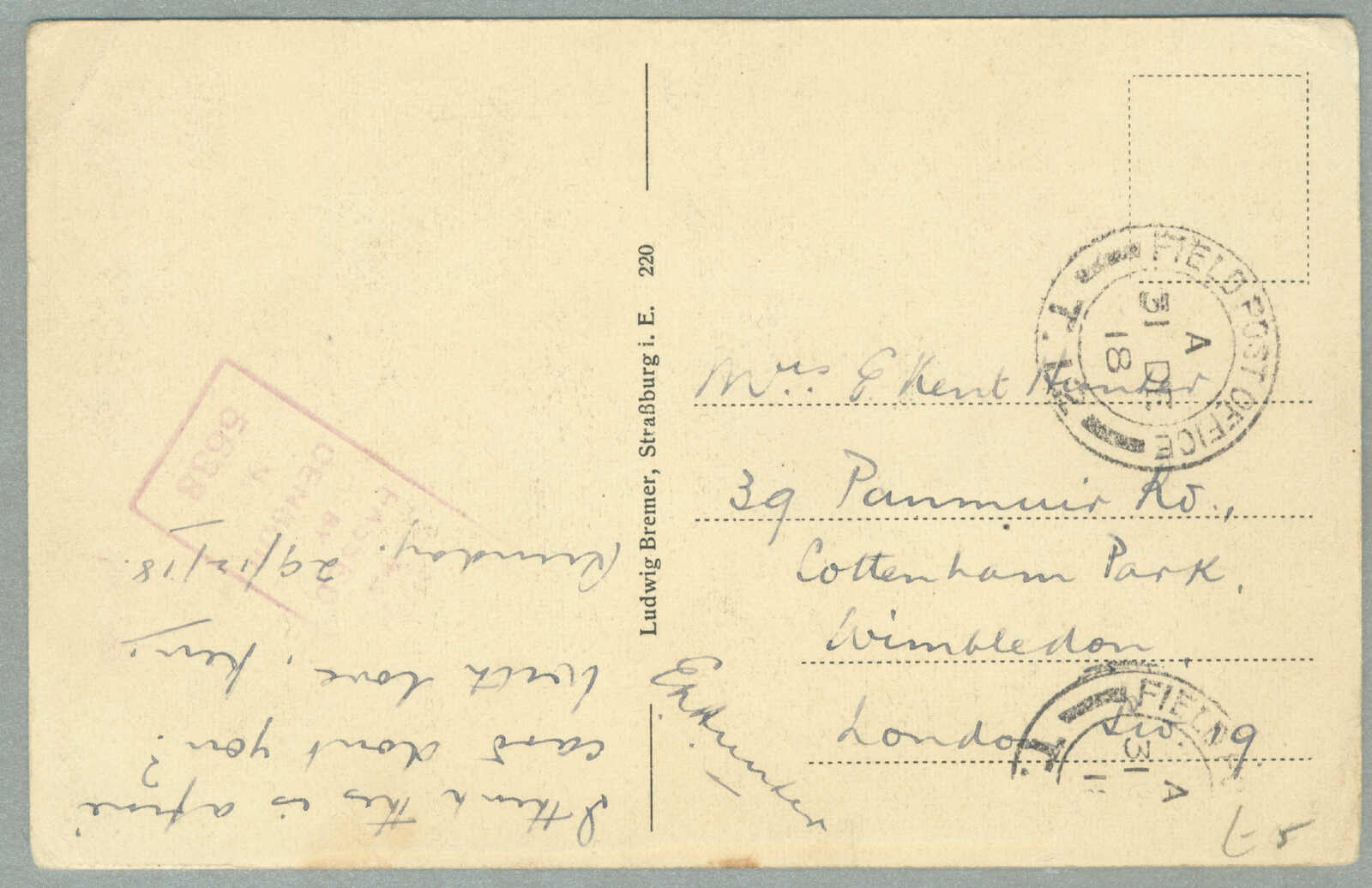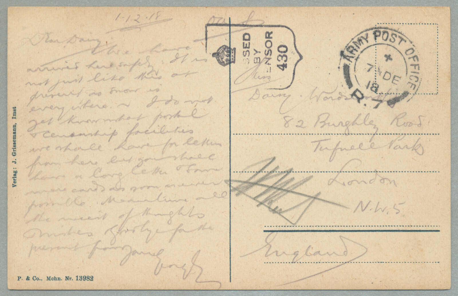 marking, violet PASSED BY CENSOR 430 handstamp, sent by member of the British occupation force in Austria following the Armistice with Austria Hungary, unit stationed in Imst from 28 November 1918 to April 1919, lack of local field post