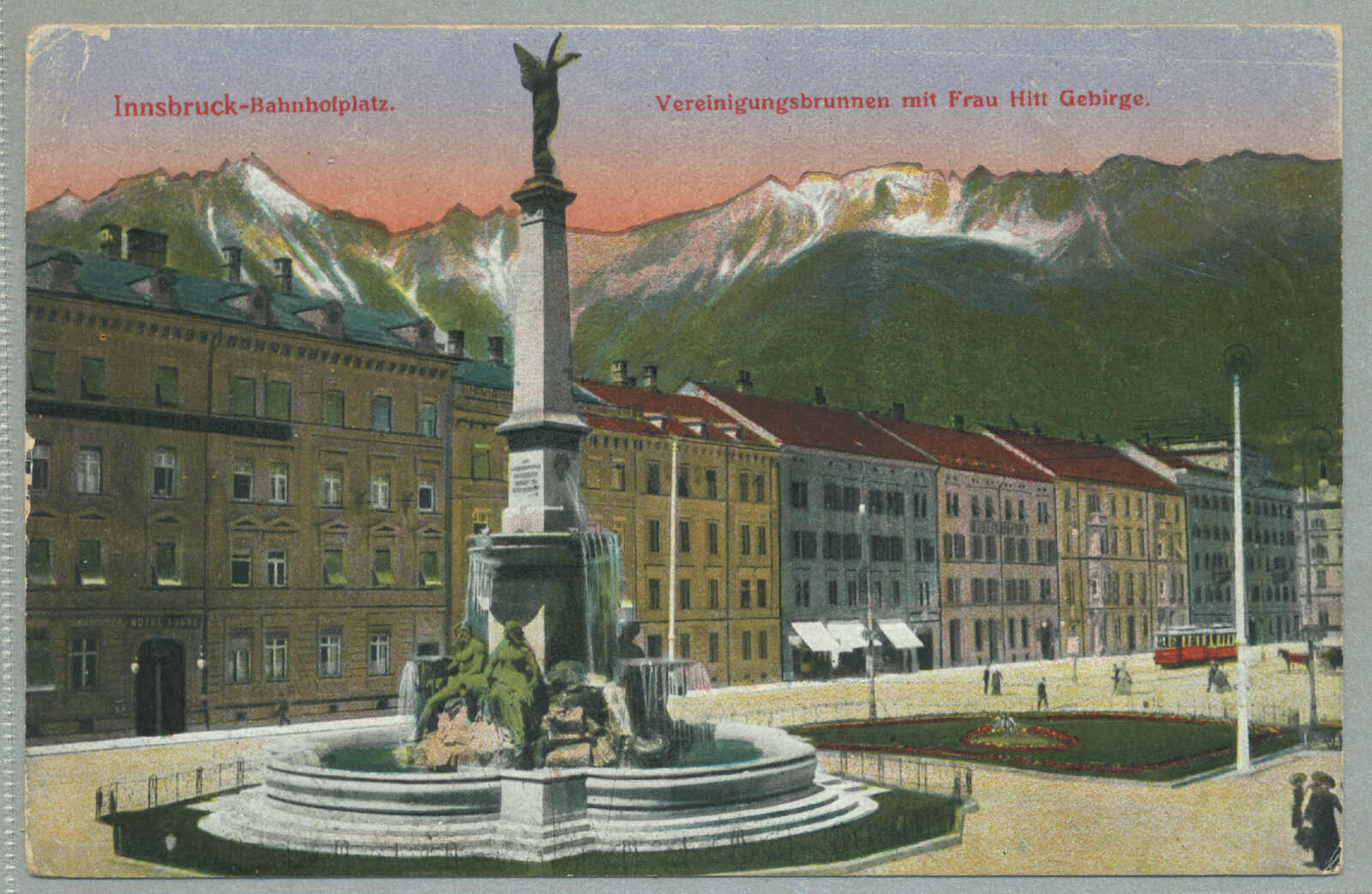 1919, British post offices abroad, from Imst, Tyrol to Redhill, Surrey, picture postcard showing Innsbruck Bahnhofplatz, franked with British field post privilege without adhesive stamp, FIELD POST OFFICE F D 3 / 20 JA 19 dispatch