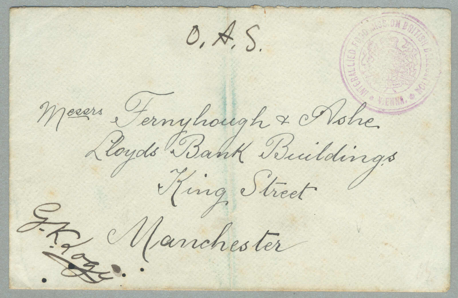 1920, British post offices in Austria, from Vienna to Manchester, diplomatic cover endorsed O.A.S., addressed to Lloyds Bank Buildings, manuscript signature of sender at lower left, struck with violet official cachet INTERALLIED FOOD