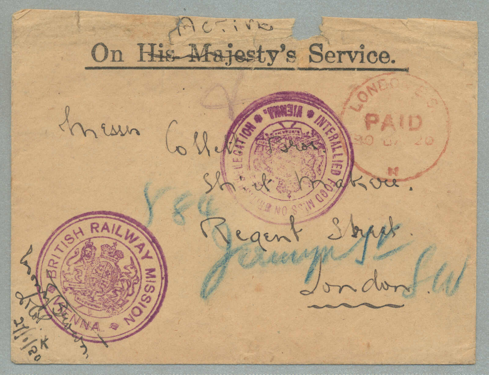 1920, British post offices in Austria, from Vienna to London, OHMS cover with printed ON HIS MAJESTYS SERVICE heading, multiple official violet cachets including BRITISH RAILWAY MISSION VIENNA and INTERALLIED FOOD MISSION BRITISH