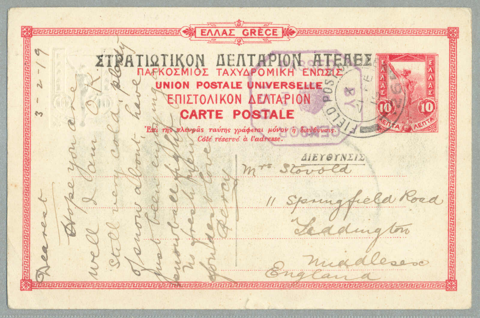 1919, British post offices abroad, from Varna to Haddington, printed Greek military postal stationery card uprated with red 10 lepta imprint, tied by FIELD POST OFFICE T26 dated 21 FEB 1919, handwritten message in English by sailor,