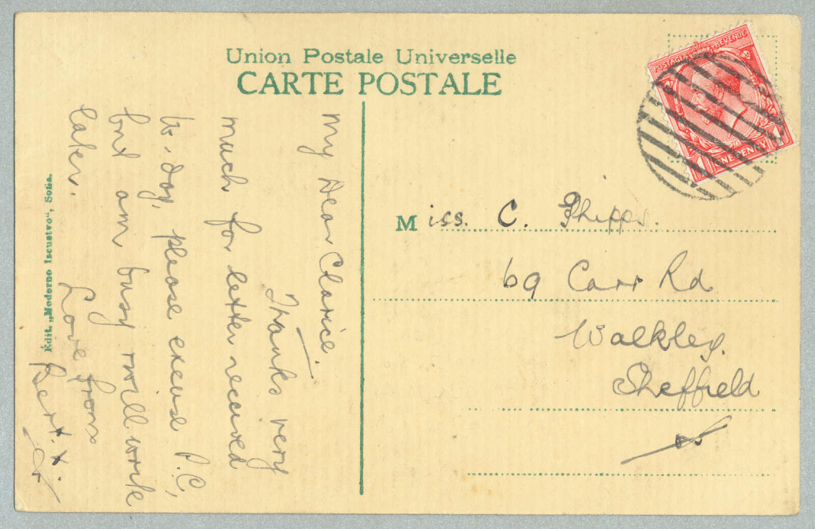 POST OFFICE 77, handwritten message in English, addressed to Walkley Sheffield, sent during British postwar occupation in Bulgaria after armistice of 30 September 1918, FPO 77 was stationed in Ruschuk modern day Ruse but postcard clearly shows Varna