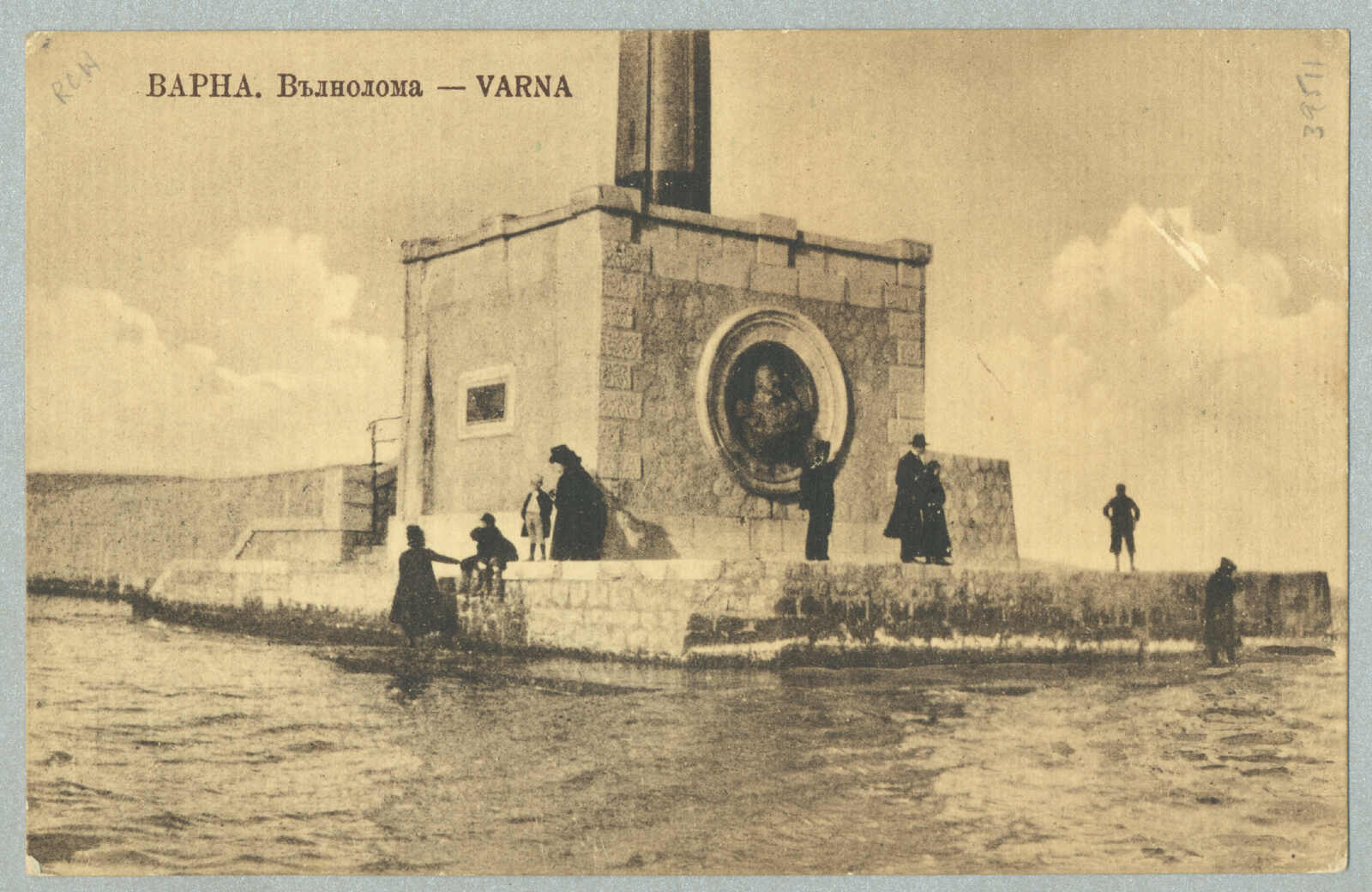 1919, British post office abroad, from Varna to Sheffield, private picture postcard with image of VARNA BREAKWATER, uprated with British 1d red stamp, King George V, tied by British barred field post obliterator with part strike of FIELD