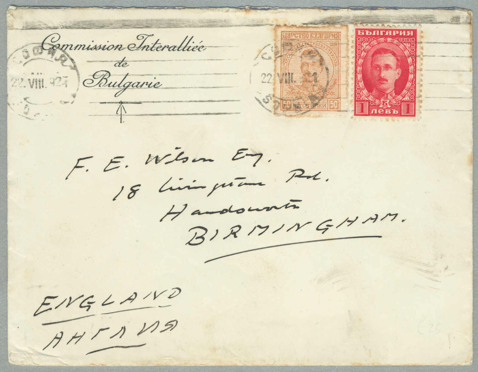 1922, British post offices abroad, from Sofia to Birmingham, official envelope with printed COMMISSION INTERALLIEE DE BULGARIE imprint, franked with Bulgarian 1 lev red and 50 stotinki orange-brown definitive stamps, tied by bilingual