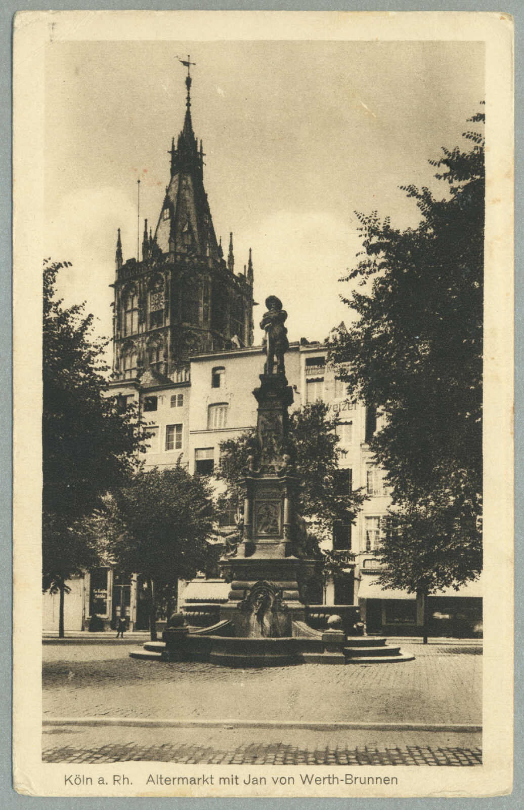 1918, British post offices abroad, from Cologne to London, picture postcard showing ALTENMARKT MIT JAN VON WERTH BRUNNEN, message in pencil, addressed to Wimbledon, FIELD POST OFFICE T12 cancel dated 31 Dec18, large violet boxed censor
