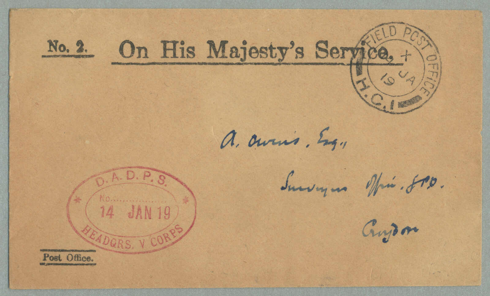1919, British post offices abroad, from Cologne to Croydon, official OHMS envelope marked ON HIS MAJESTYS SERVICE, postmarked FIELD POST OFFICE H C 1 dated 14 JA 19, struck additionally with large oval red cachet DADPS HEADQRS V CORPS 14