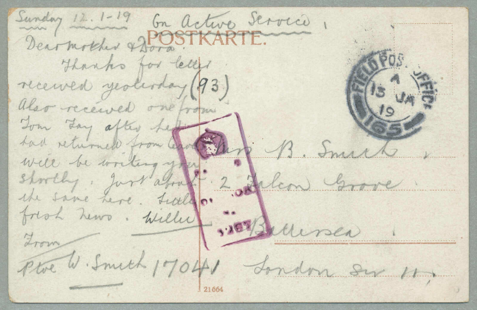dated 13 JA 19, large violet boxed censor cachet PASSED BY CENSOR 9307, manuscript ON ACTIVE SERVICE and soldier's unit information, written by member of Guards Division stationed at Cologne, sent free of postage under military privilege, early