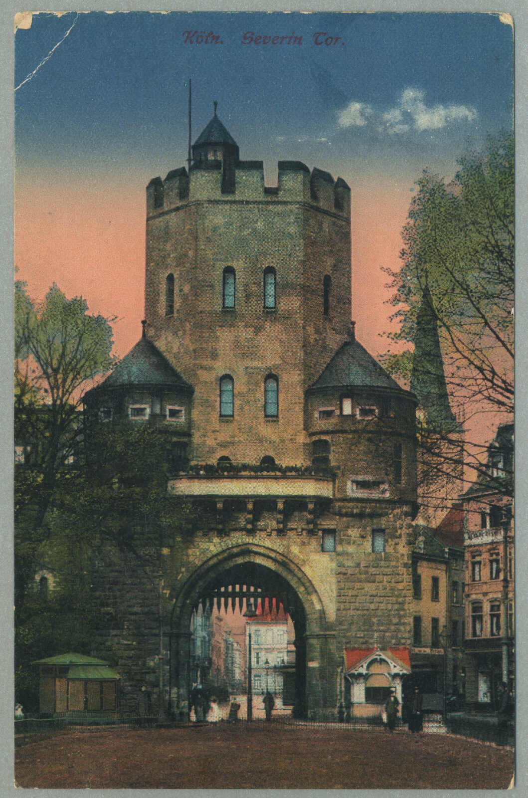 1919, British post offices abroad, from Cologne to London, colored picture postcard depicting SEVERINSTOR KÖLN, sent by British soldier during early occupation of the Rhineland, datelined 12 January 1919, FIELD POST OFFICE 165 cancel