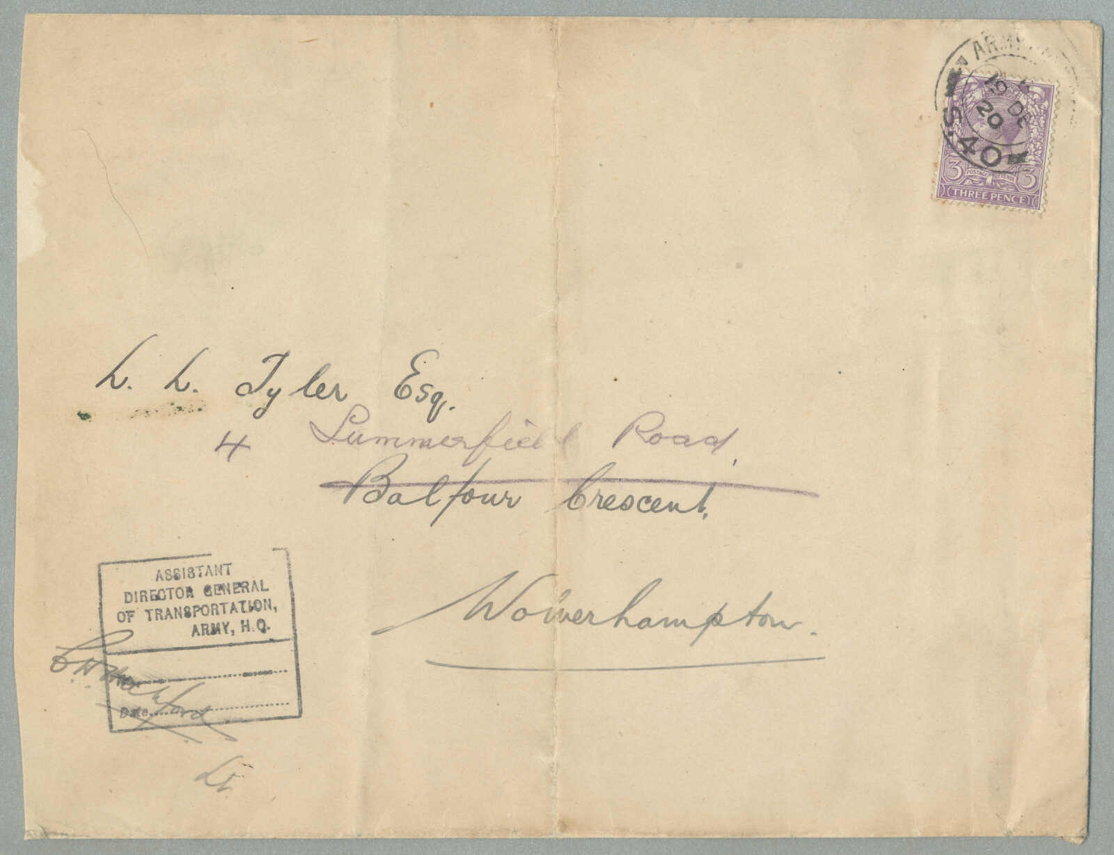 1920, British post offices abroad, from Cologne to Wolverhampton, cover franked with Great Britain 3d violet stamp, tied by ARMY POST OFFICE S 40 cancel dated 19 DEC 20, endorsed by office of ASSISTANT DIRECTOR GENERAL OF TRANSPORTATION