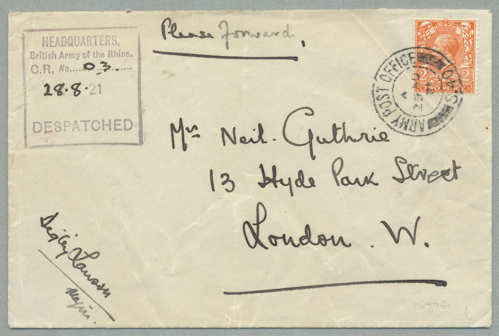 1921, British post offices abroad, from Cologne to London, cover franked with Great Britain 2d orange, tied by ARMY POST OFFICE S 40 cancel dated 29 AU 21, endorsed with boxed cachet of HEADQUARTERS British Army of the Rhine, dated