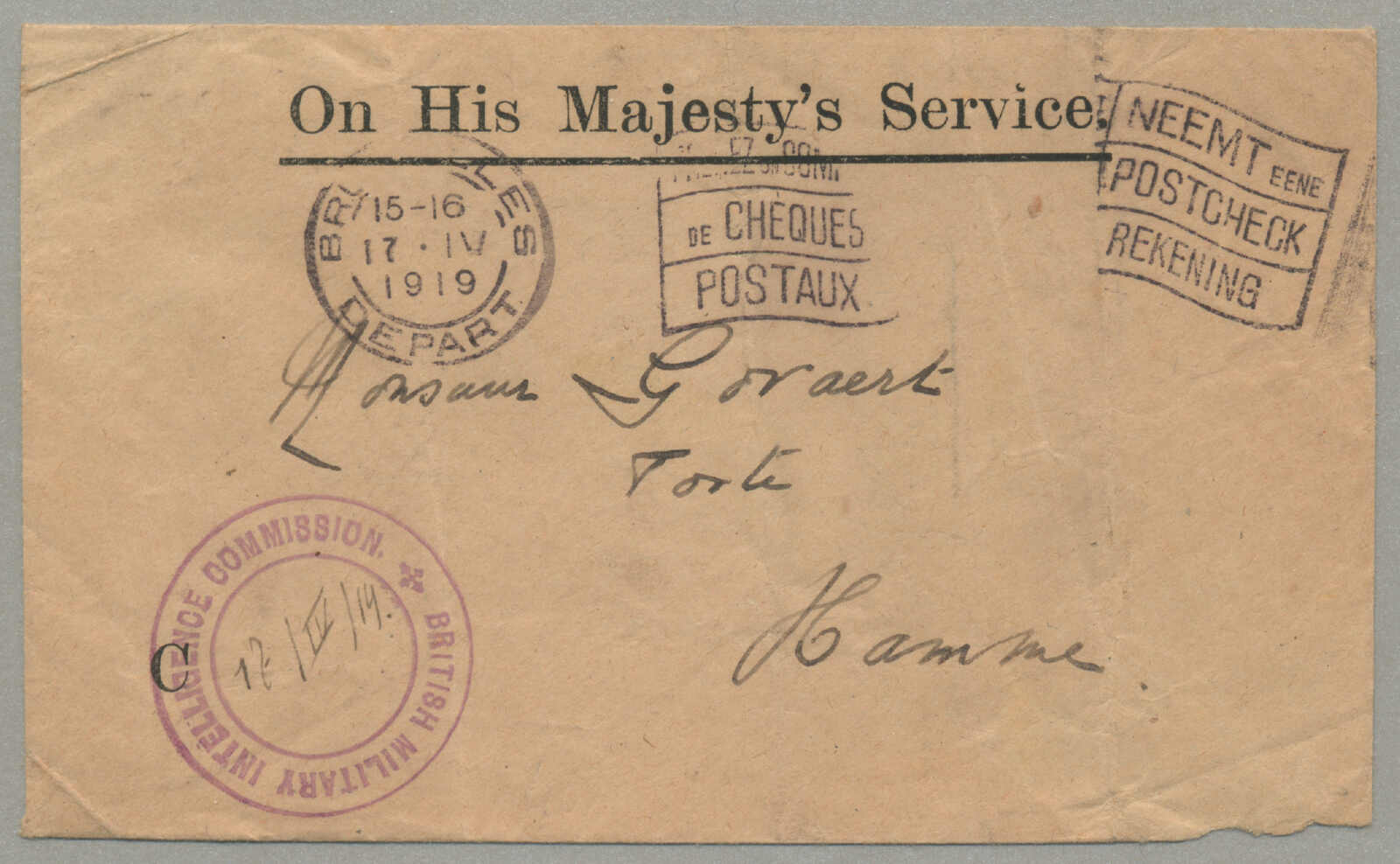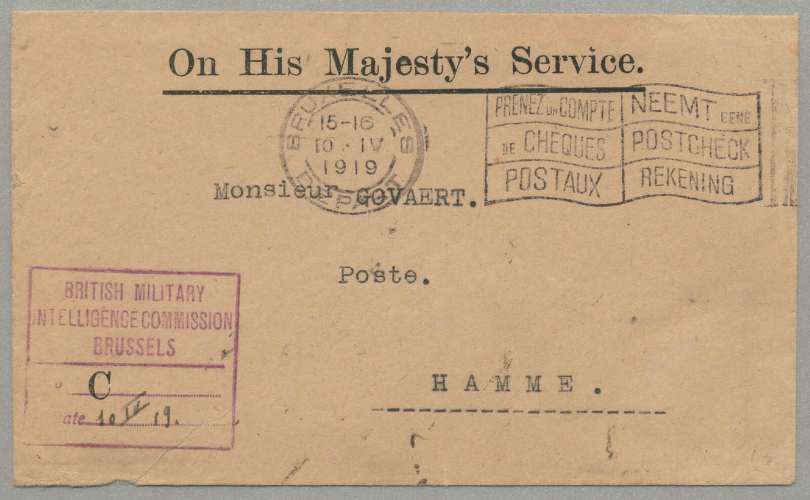 1919, from Brussels to Hamme, stampless official cover endorsed ON HIS MAJESTYS SERVICE, circular date stamp BRUXELLES 10 IV 1919, boxed violet cachet BRITISH MILITARY INTELLIGENCE COMMISSION BRUSSELS with manuscript date 10/4/19 and