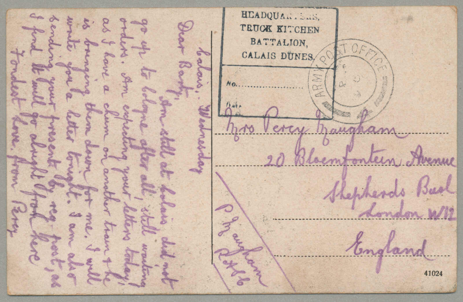 in use at Calais, showing cachet of a British truck kitchen unit stationed in France during the final phase of British postwar military presence on the continent, part of the evacuation process coordinated via Calais, rare and colorful souvenir from