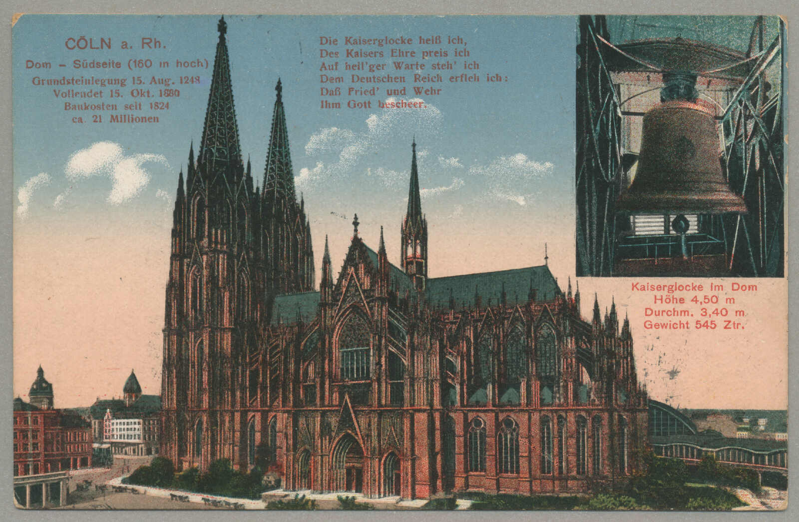 1919, from Calais to London, multicolor picture postcard of the Cologne Cathedral and Kaiser bell, card headed HEADQUARTERS TRUCK KITCHEN BATTALION CALAIS DUNES, addressed to England, cancelled ARMY POST OFFICE 4 / 24 OC 1919, handstamp