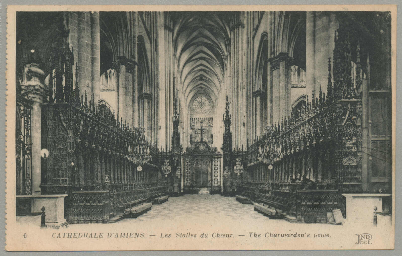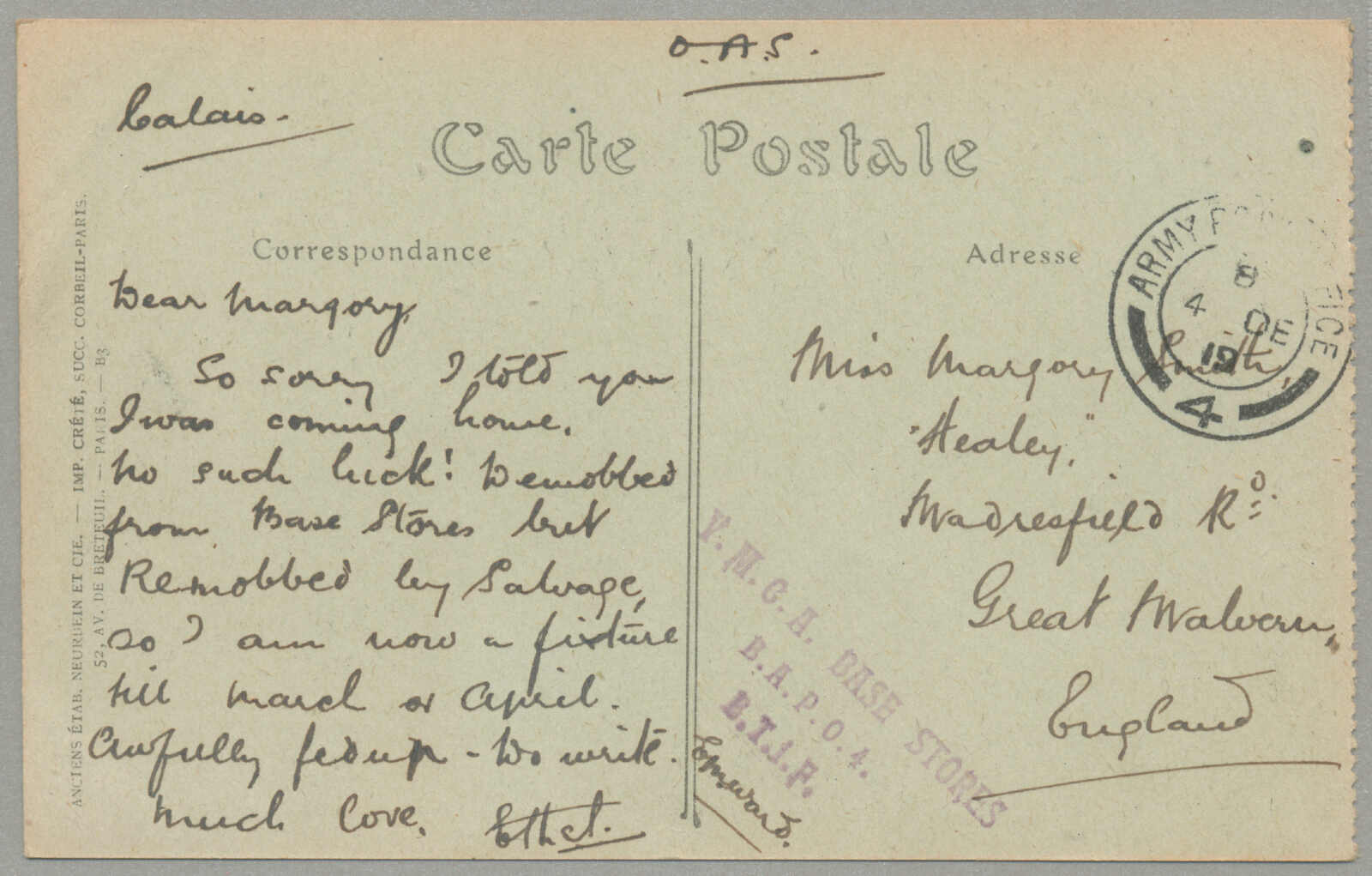 1919, from Calais to Great Malvern, England, picture postcard showing interior of the Amiens Cathedral, message headed CALAIS and OAS, cancelled ARMY POST OFFICE 4 dated 4 DE 19, violet unit cachet YMCA BASE STORES BAPO4 BTIF, written