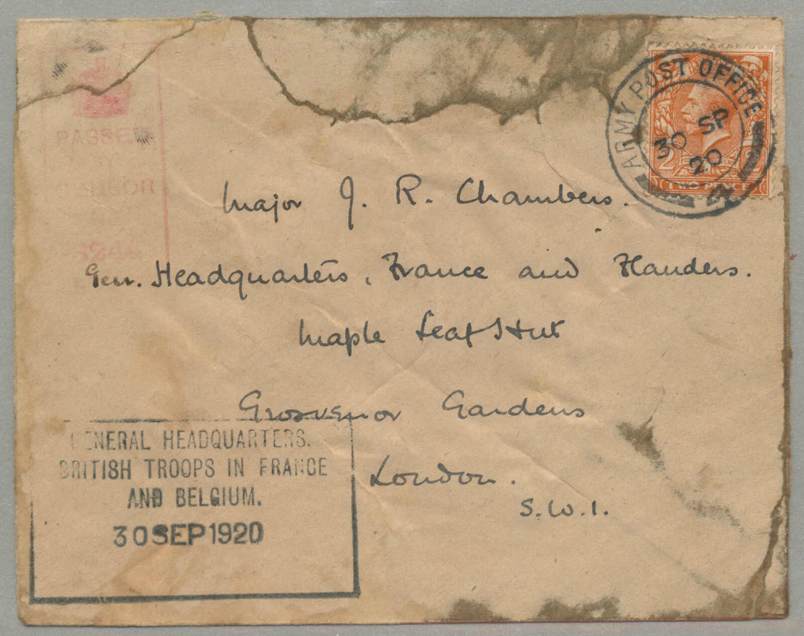 1920, from Calais to London, censored cover franked with 2d orange George V, tied by ARMY POST OFFICE 4 dated 30 SP 20, boxed handstamp GENERAL HEADQUARTERS BRITISH TROOPS IN FRANCE AND BELGIUM 30 SEP 1920, red boxed PASSED BY CENSOR
