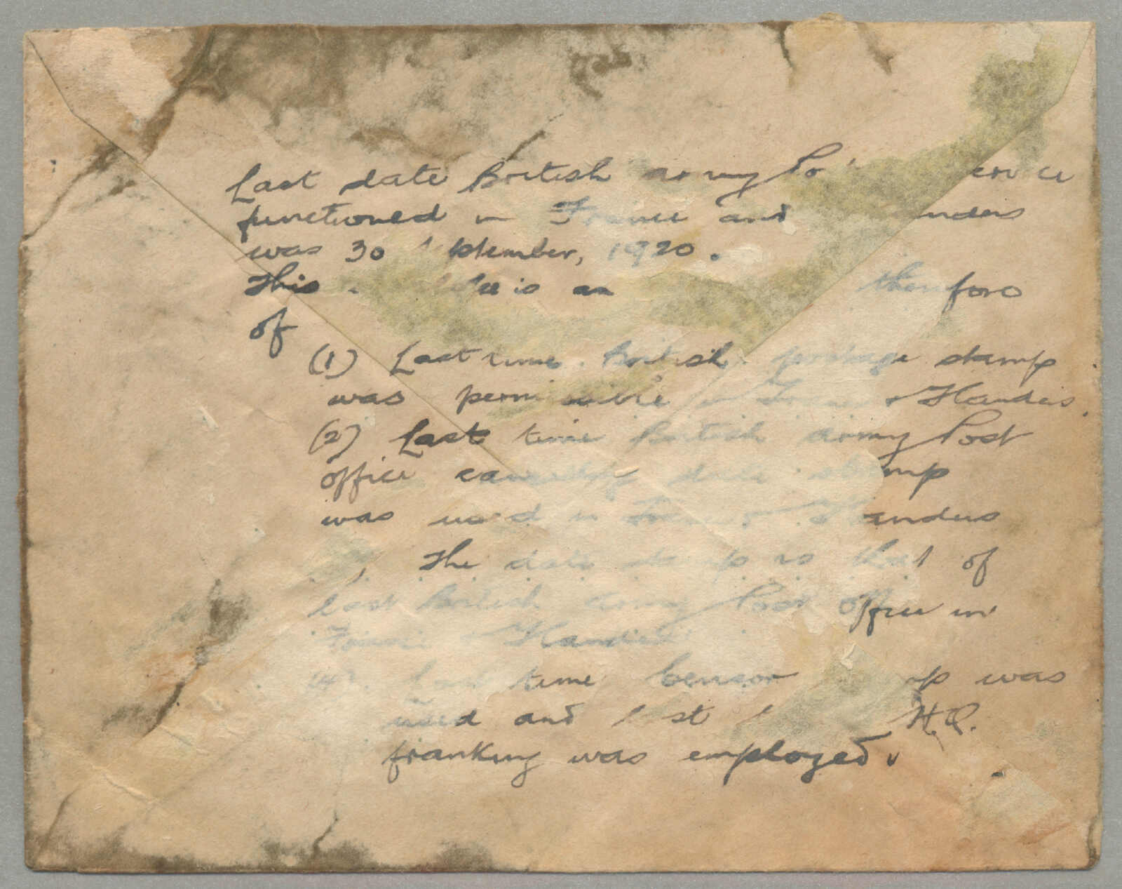 handstamp, addressed to Major J. R. Chambers, envelope with multiple handwritten notes on reverse indicating it was the last day of operation for the British Army Post Office in France and the final permitted use of British stamps from APO 4,