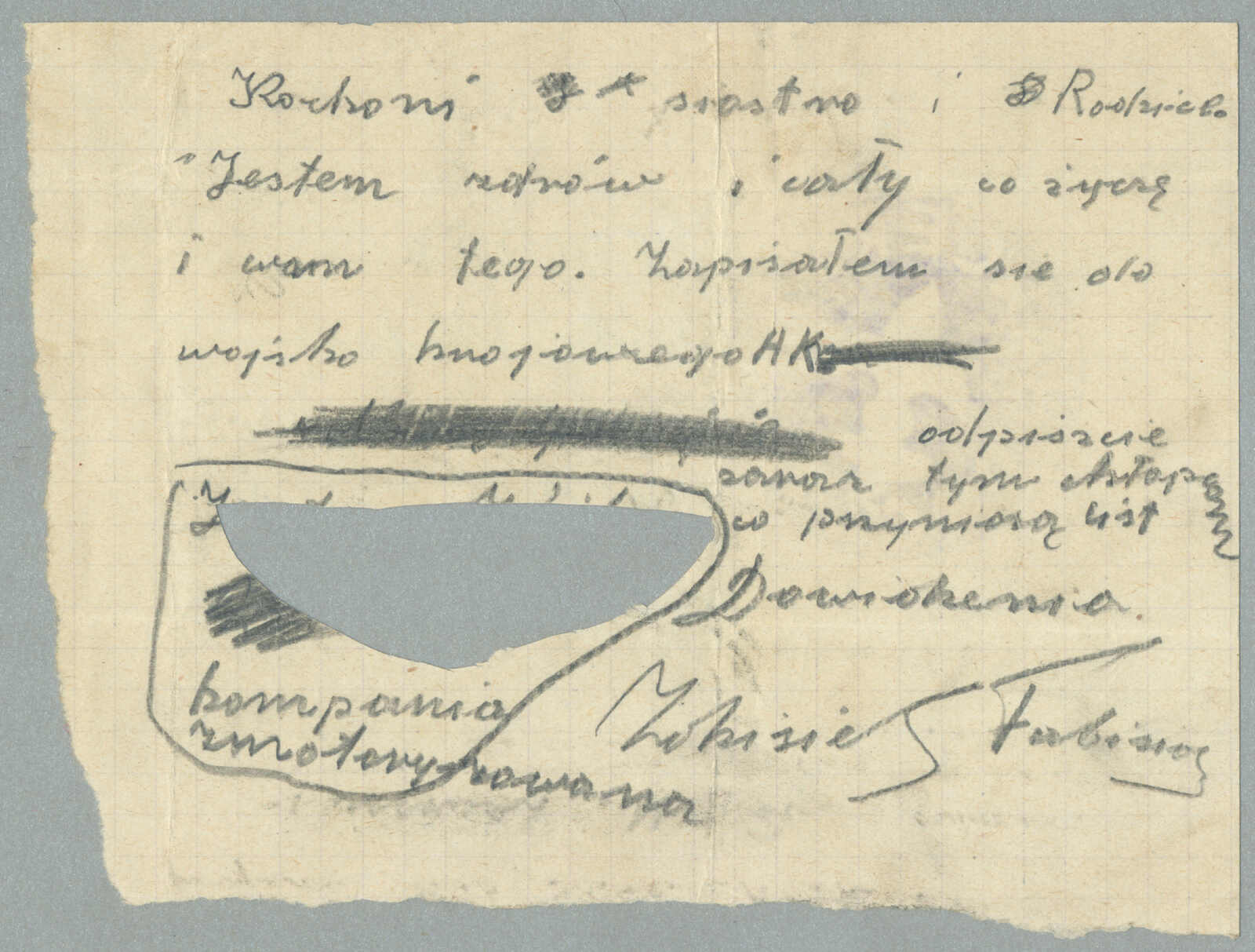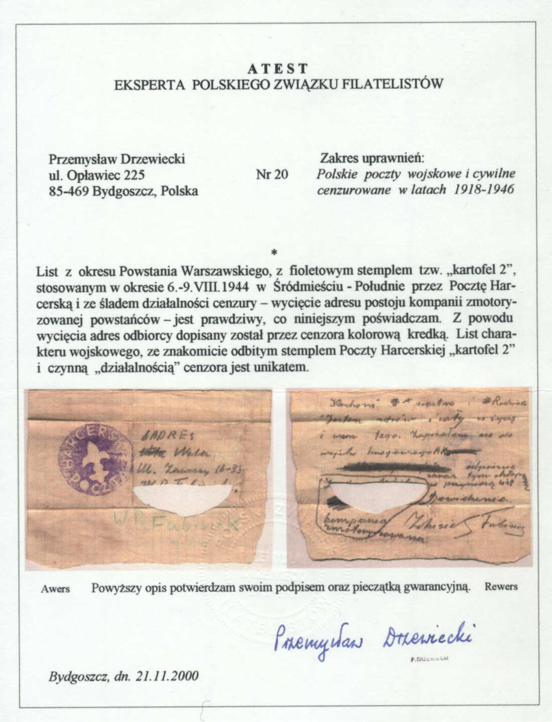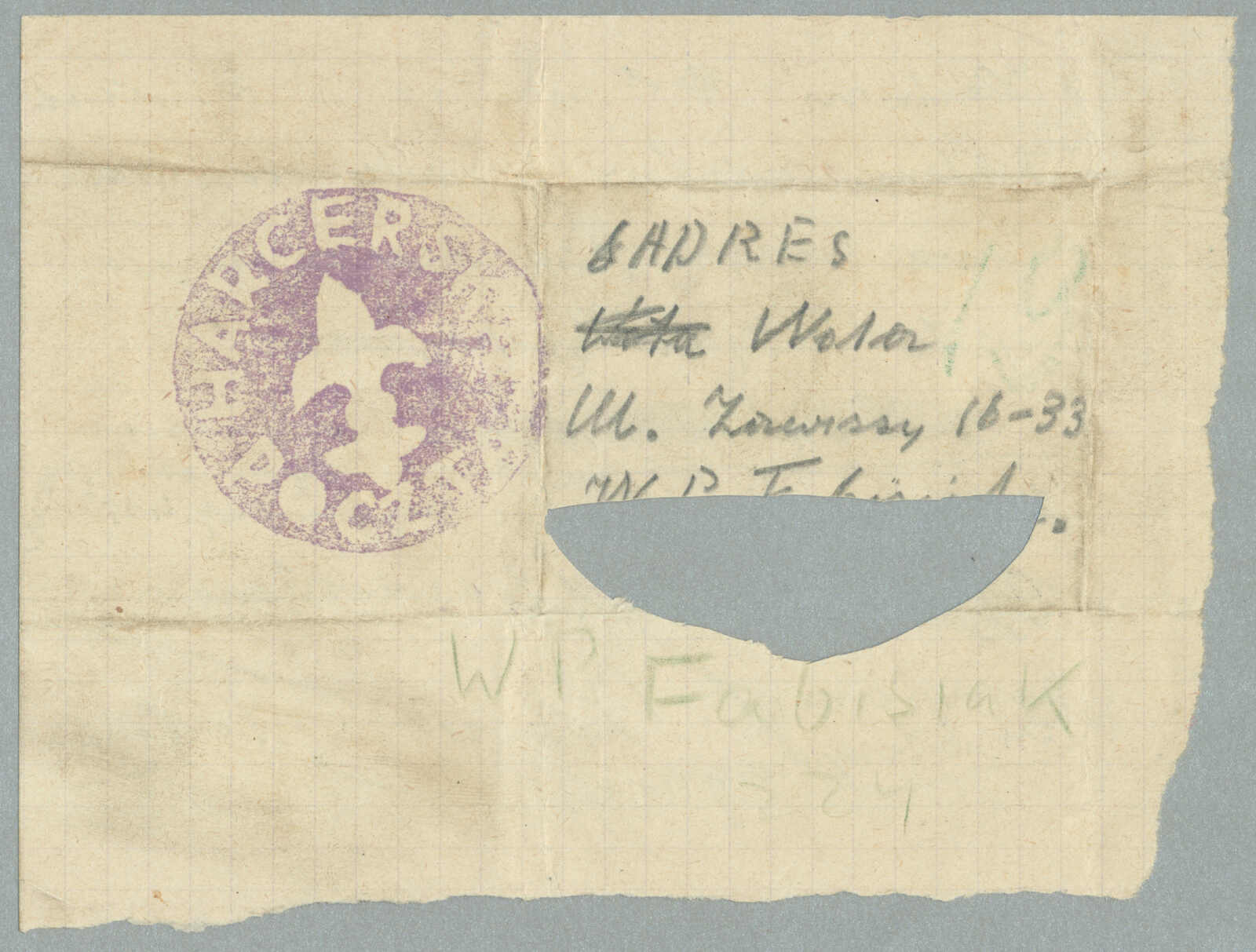 6501 on cover image1944, Scout field post letter sheet carried locally during the Warsaw Uprising, full violet strike of SCOUT POST OFFICE cancel type 2 (kartofel 2), produced from linoleum, used between 6 and 9 August 1944 in the southern city center, message censored due to military content, cut out section removed by scout censor, addressee rewritten in green pencil by censor on recto, senders full message and name preserved on reverse, contents reference unit and location of delivery, rare example of active censorship by Scout Mail with characteristic cutout and rewriting, cert Drzewiecki, XF! Estimate 4.000€. (Image) (imagea) (imageb) (All Images)