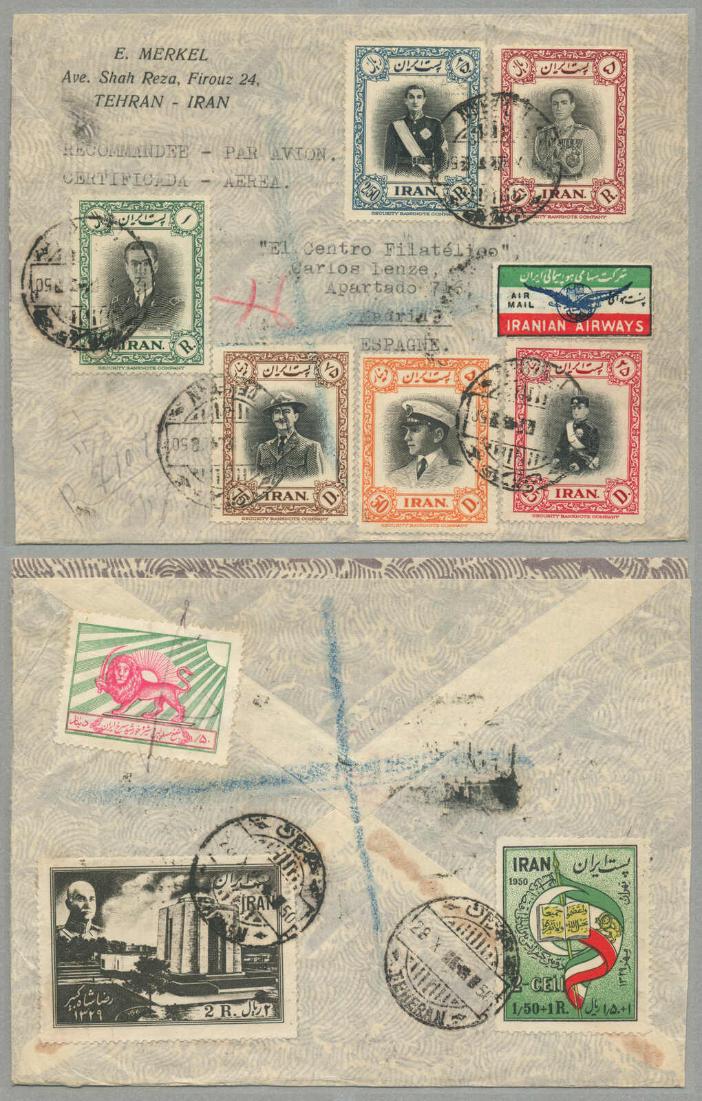 6511 on cover image1950, from Teheran to Madrid, commercial registered airmail cover franked with (9) Iranian stamps including 2 Rials Reza Shah black and white, 1.50 + 1 Rial green Scout issue for the 3rd birthday of the Shah, red Red Lion and Sun charity stamp (Red Cross), plus various values from the Scout series depicting military and scouting figures, all tied by TEHERAN 28.10.50 and other Iranian datestamps, green and red IRANIAN AIRWAYS etiquette label, total postage 13 Rials, large-format envelope with printed address and bilingual postal inscription, historically significant Scout-related issue and complete franking with additional mandatory charity stamp, extremely fresh and scarce commercial usage, very fresh and desirable, XF! Estimate 900€. (Image)