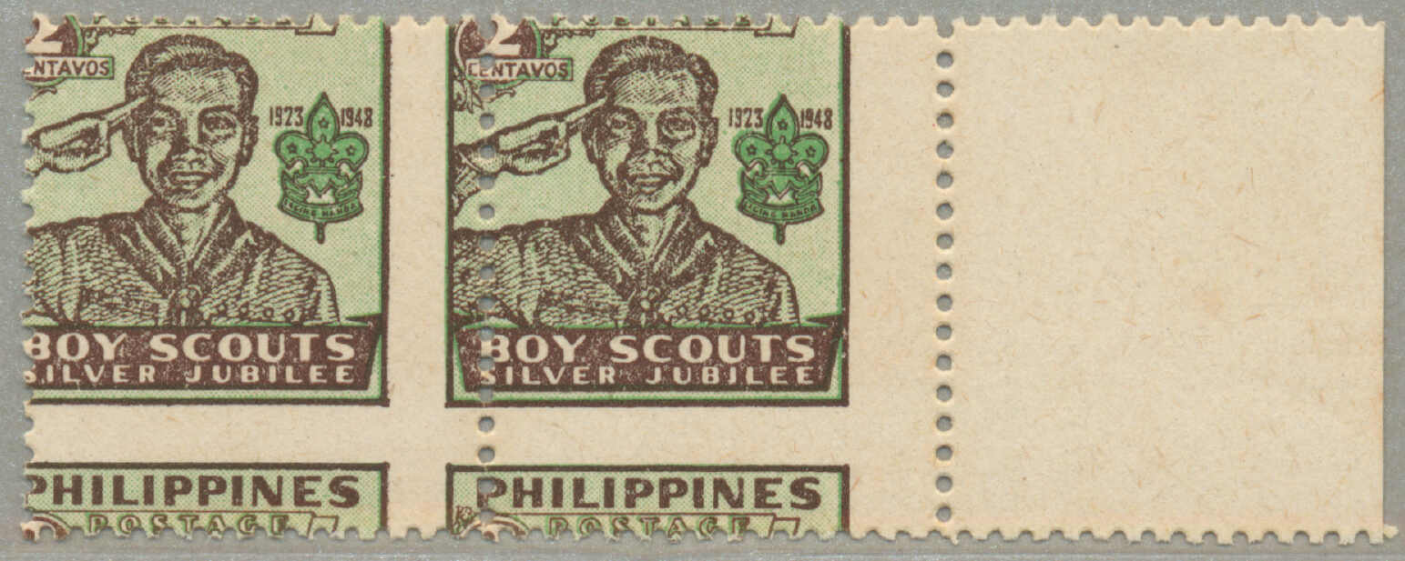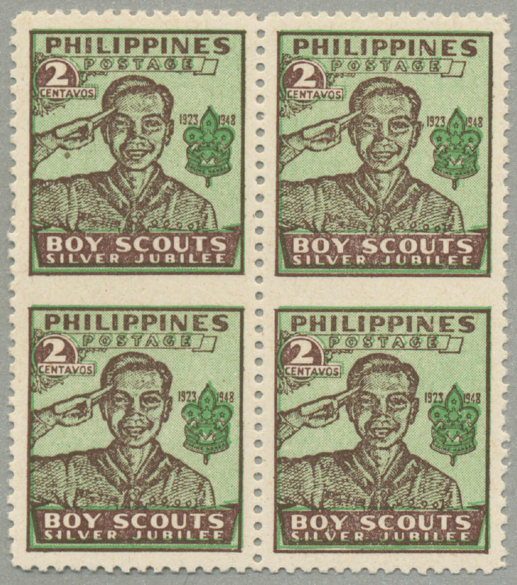 6507 nh image1946, block of (4) 2c Boy Scouts SILVER JUBILEE stamps, brown and green, horizontally imperforate between top and bottom pairs, full original gum, mint never hinged, striking perforation error on postwar Philippine commemorative showing misfed sheet during production, VF! Estimate 120€. (Image) (imagea) (All Images)